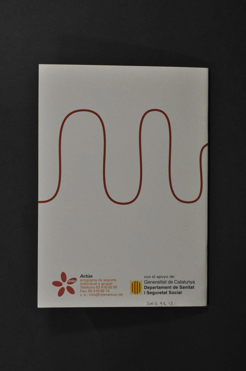 La couverture blanche porte le titre en bleu dans sa partie supérieure, un motif d'entrelacs colorés bordeaux, jaunes et bleus évoquant l'enlacement et la solidarité., puis le sous-titre en partie inférieure. Le motif se poursuit dans le dos du dépliant, sous forme de sinusoïdale le parcourant de part et d'autre. En bas, à droite, en brun et blanc, les logos d'Actua et de la Generalitat apparaissent. A l'intérieur, sur fond blanc, les textes sont imprimés en bleu, tandis que les titres et mentions importantes en brun. Des volutes sont présentes sur de nombreuses pages. Des pages sont lignées et laissées blanches en vue de notations personnelles. La dernière page comporte la présentation des programmes et des services de support de l'association.Inscriptions
