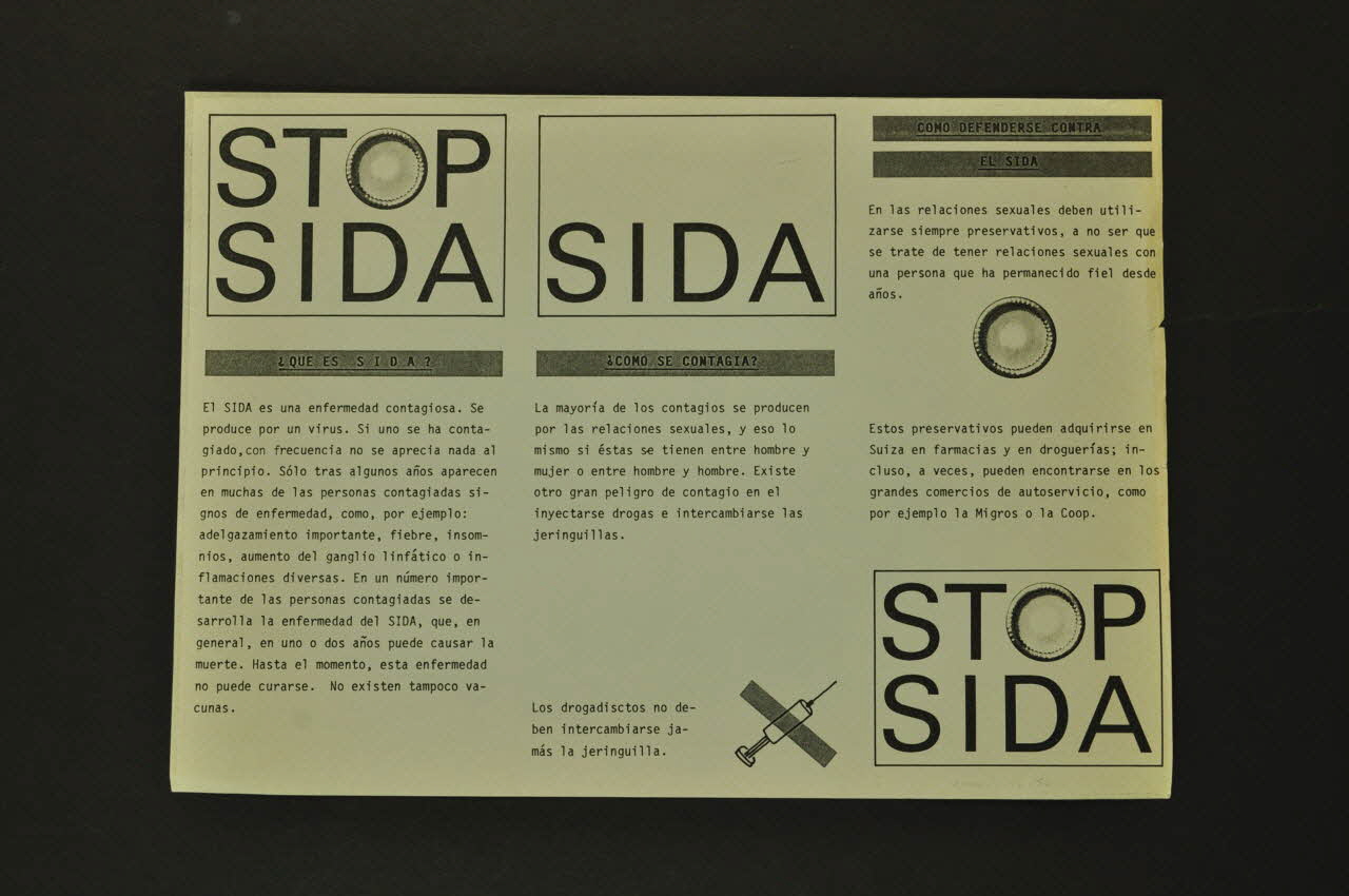 DONDE NO PUEDE UNO CONTAGIARSE // CON EL SIDA // // OBSTENTA UD. PREQUNTAS (titre des différentes sections de texte, de gauche à droite), versoInformacion breve (sous le grand logo), versoDepartamento Federal de la salud publica / Comision Federal para los problemas de los extranjeros (au centre du bord inférieur, nom de l'organisme publicateur), versoLogo, titre