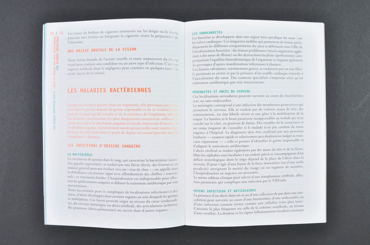 Introduction 4 // // Les pratiques dangereuses et les conseils de prévention 6 // // - Comment préparer l'injection ? 10 // [...] // - L'injection 19 // [...] // Après l'injection 23 // [...] // // Les risques infectieux 25 // // Introduction 25 // [...] // - Les symptômes qui doivent alerter 28 // [...] // Les maladies bactériennes 30 // [...] // Les mycoses profondes 35 // Les hépatites virales 36 // [...] // Le VIH/Sida 40 // [...] // Les autres risques infectieux 43 // [...] // Les conseils de prévention 46 // [...] // Le dispositif de prévention et de prise en charge 48 // // L'accès à du matériel stérile 48 // [...] // Les programmes de réduction des risques 49 // [...] // Les centres spécialisés de soins pour toxicomanes (CSST) en ambulatoire 50 // // Téléphones utiles 51 // Que faire en cas d'overdose ? 52 // Centre de documentation 57 (première page), à l'intérieurDécor