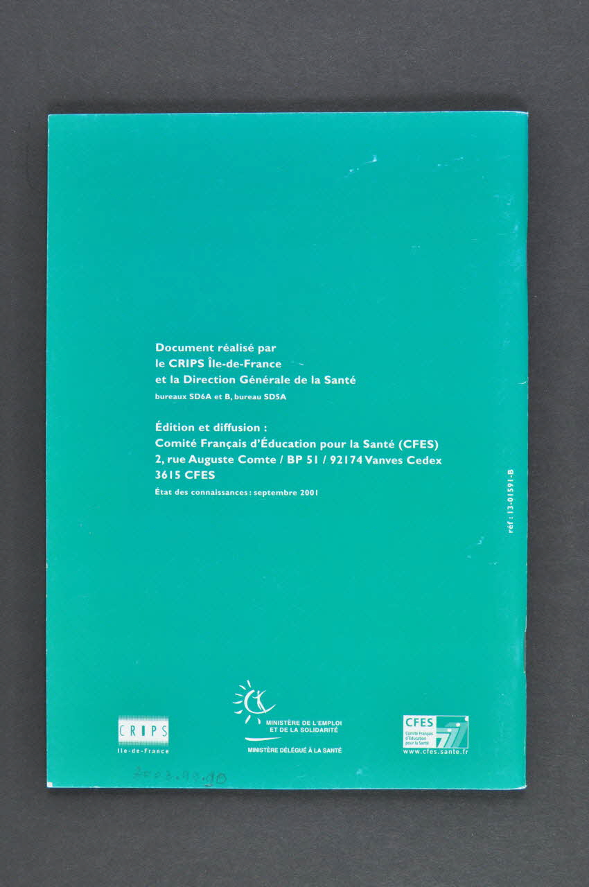 Ministère de l'emploi // et de la solidarité // Ministère délégué à la santé // // CRIPS // ile de france (en bas), rectoCRIPS // ile de france // // Ministère de l'emploi // et de la solidarité // Ministère délégué à la santé // // CFES // Comité Français // d'éducation pour la Santé // www.cfes.sante.fr (en bas), versoSous-titre, date