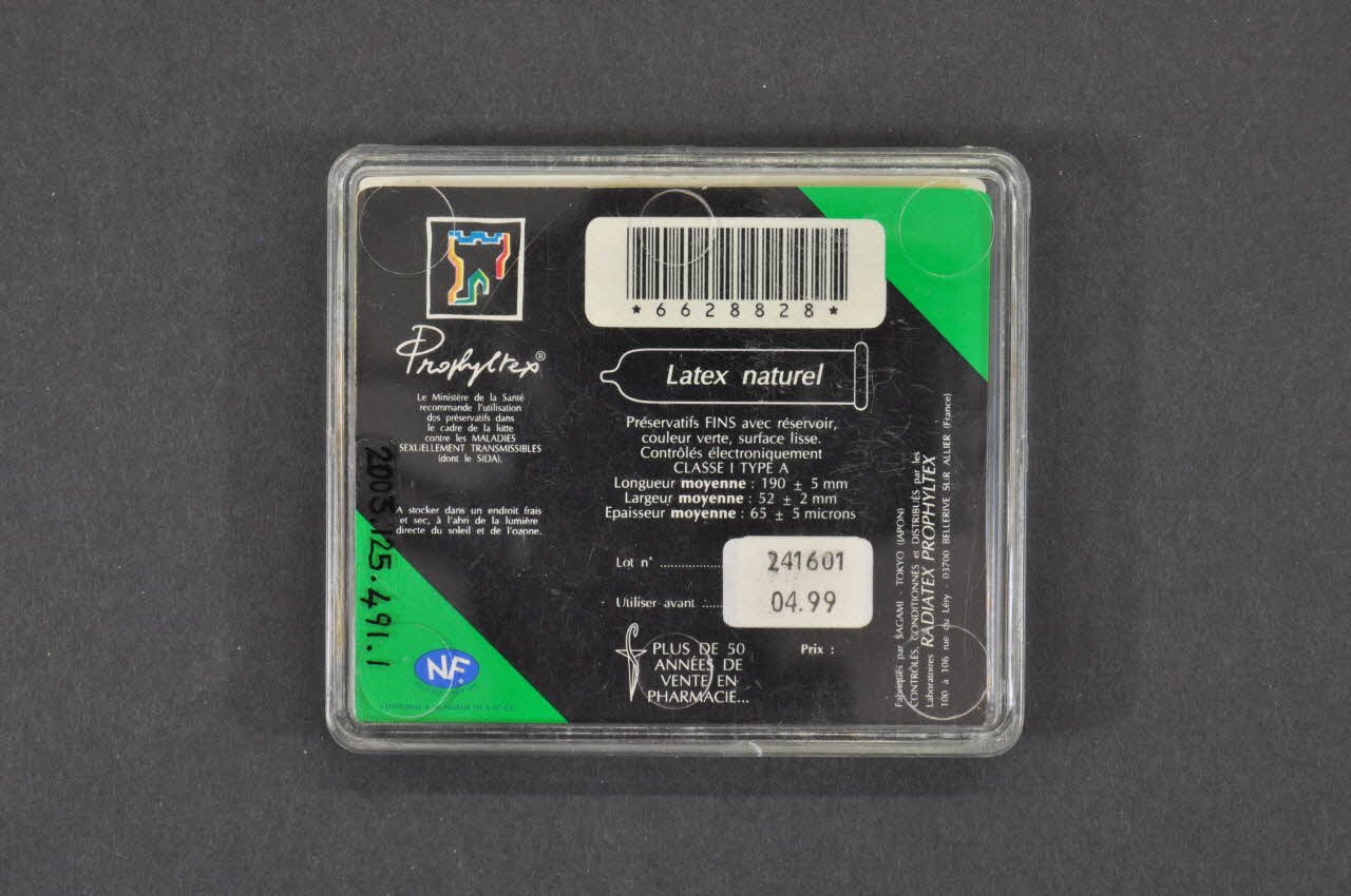 Prophyltex (Marque de préservatif inscrit sur le couvercle de la boîte et sur le papier glacé à l'intérieur), au centreTexte