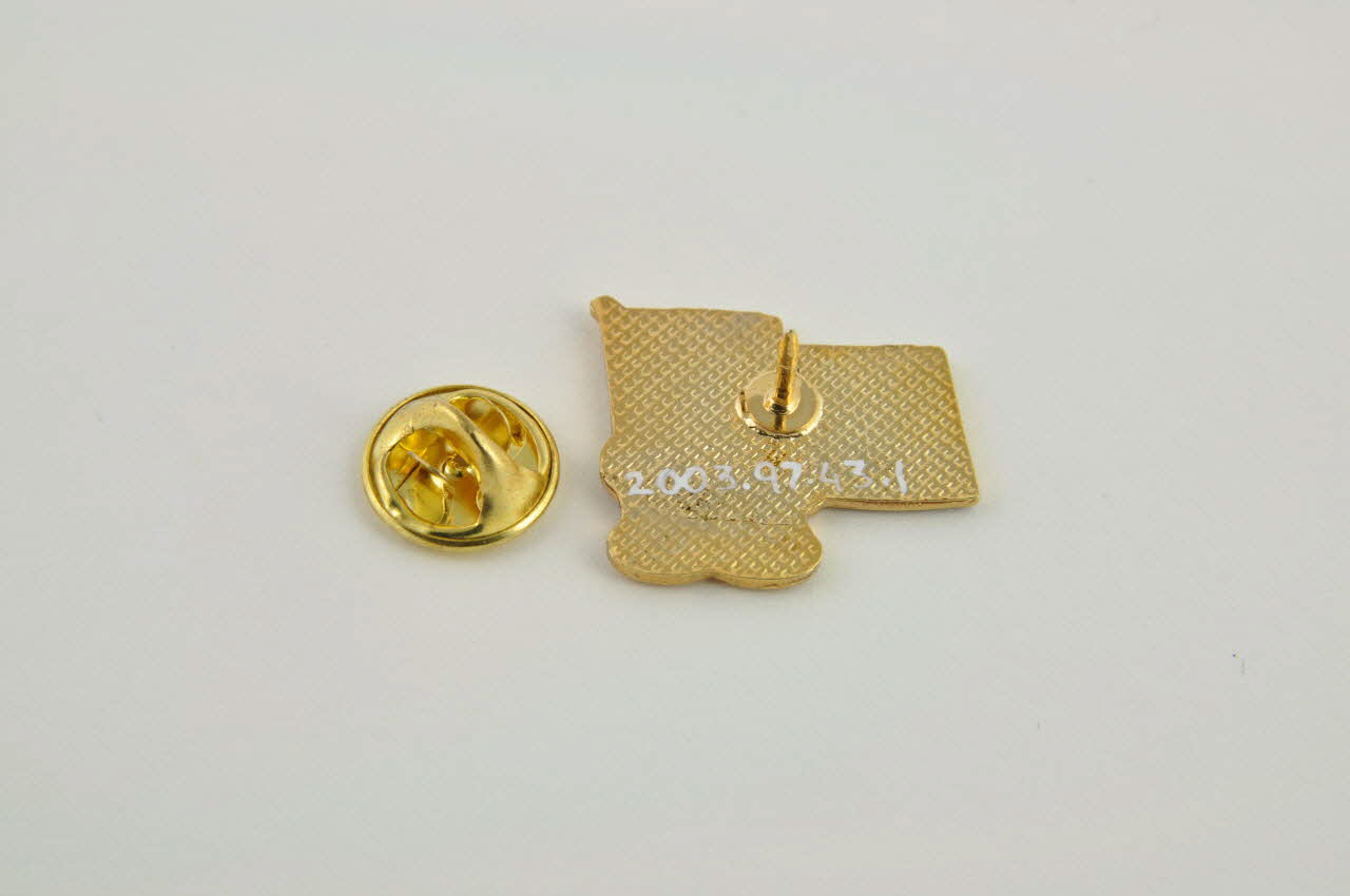 Métal moulé émaillé. / Pin's en métal brun clair représentant un petit ours portant un grand drapeau arc en ciel. Le contour de l'ours est surligné de doré. Il porte, sur son côté gauche, un ruban rouge.Décor