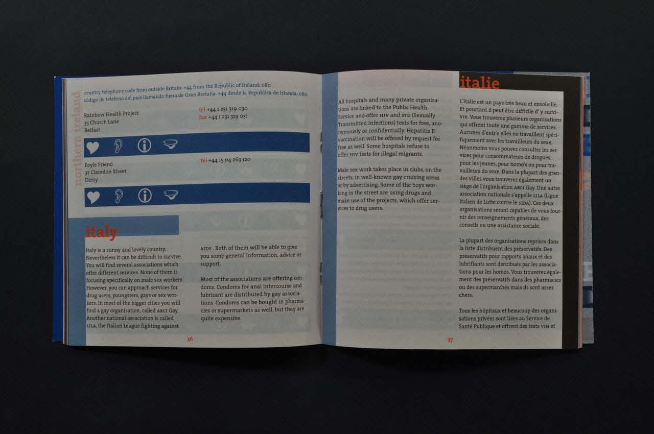 La brochure traite du thème de la prostitution masculine dans dix-neuf pays européens. Elle se décompose en plusieurs parties ayant chacune pour titre un pays. Chaque chapitre se présente de la même manière: une présentation multilingue puis une liste d'adresses d'associations avec des symboles.