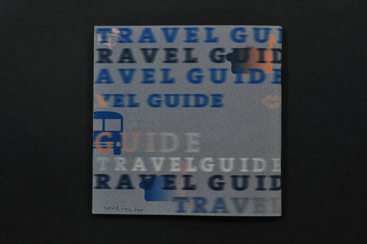 La couverture est en papier glacé. Sur le fond gris des première et deuxième de couverture se détache la répétition du titre, dans les tons bleus, noirs et blancs. En sous-impression, des dessins stylisés de lèvres, canapés, lampes et véhicules sont visibles. Les deuxième et troisième de couverture sont de couleur bleu foncé. La couverture arrière est pliée vers l'intérieur de la brochure ; le graphisme du quatrième de couverture se prolonge sur son extérieur, tandis qu'un texte est inscrit en blanc sur un bandeau vertical. A l'intérieur de la pliure, sont disposés des textes accompagnés de leurs symboles.