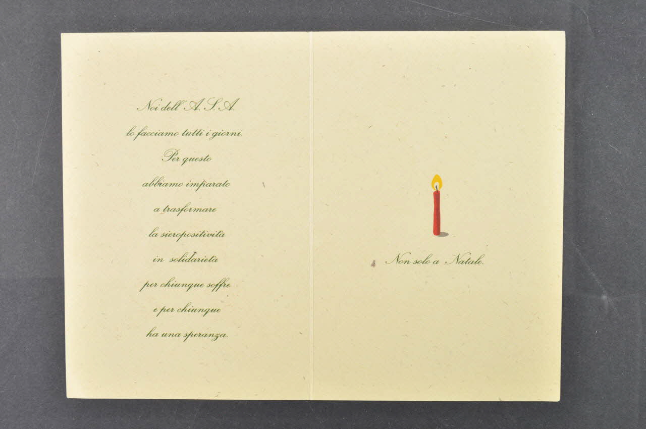 Buon Natale da chi pensa positivo. (sous le dessin), rectoNon solo a Natale. (intérieur droit, sous la bougie)Noi dell'ASA lo facciamo tutti i giorni. // Per questo abbiamo imparato a trasformare la sieropositività in solidarietà per chiunque soffre e per chiunque ha una speranza. (intérieur gauche)Logo