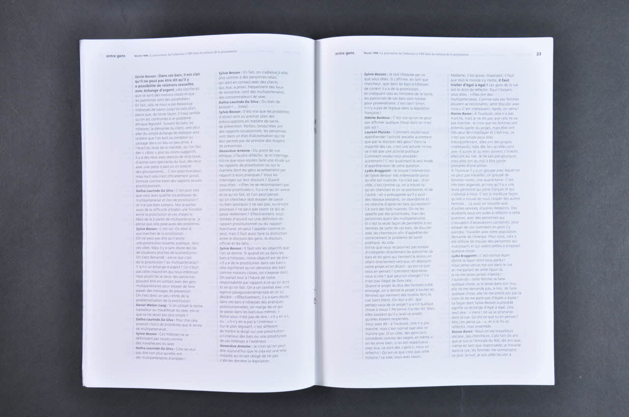 Cette revue en français, numéro 4 de "entre gens", est composée de quarante-trois pages. La couverture présente une introduction imprimée en noir sur blanc, le titre dans le haut sur un chiffre en vert, un logo dans le bas et, sur le bord gauche, verticalement, le nom de la revue en vert, dédoublé en vert clair et comportant un logo au centre. Le numéro de la revue et la date sont précisés en petits caractères à deux reprises, dans le haut à gauche et dans le bas à droite verticalement. Le dos comprend le sommaire, reprend le numéro et la date et présente, à droite, la suite de la marge du recto. L'intérieur présente une série d'articles ou de débats imprimés en noir et disposé en deux colonnes sur chaque page. Ces colonnes sont matérialisées par de fins filets noirs. Aucune illustration ni couleur ne sont présentent. La revue possède une conclusion ainsi que la liste et les coordonnées des différents participants. En effet, ce numéro reprend les exposés et les discussions d'une journée organisée par l'AFLS le 15 janvier 1993, journée réunissant des équipes ayant mené, avec l'aide de l'agence, des actions de prévention de terrain auprès des prostitué(e)s.Inscriptions