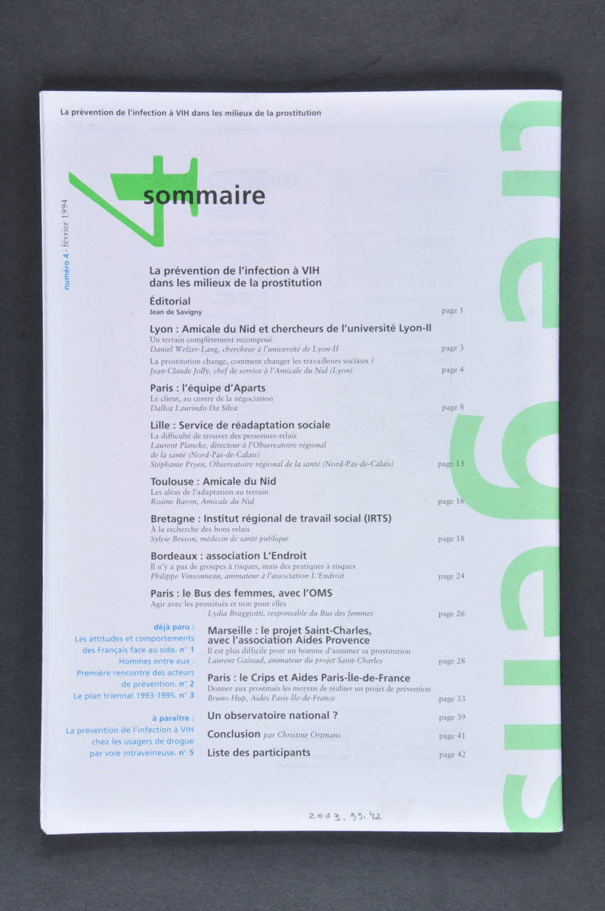 Editorial // Jean de Savigny // // Lyon : Amicale du Nid et chercheurs de l'Université Lyon II // - Un terrain complètement recomposé // Daniel Welzer-Lang // // - La prostitution change, comment changer les travailleurs sociaux ? // Jean-Claude Jolly // // Paris : l'équipe d'Aparts // - Le client, au centre de la négociation // Dallva Laurindo Da Silva // // Lille : Service de réadaptation sociale // - La difficulte de trouver des personnes relais // Laurent Planche, Stéphanie Pryen // // Toulouse : Amicale du Nid // - Les aléas de l'adaptation au terrain // Rosine Baron // // Bretagne : Institut régional de travail social (IRTS) // - A la recherche des bons relais // Sylvie Besson // // Bordeaux : association l'Endroit // - Il n'y a pas de groupes à risque mais des pratiques à risque // Philippe Vinsonneau // // Paris : le Bus des femmes, avec l'OMS // - Agir avec les prostituées et non pour elles // Lydia Braggiotti // // Marseille : le projet Saint-Charles avec l'association Aides Provence // - Il est plus difficile pour un homme d'assumer sa prostutution // Laurent Gaissad // // Paris, le Crips et Aides Paris-Ile-de-France // - Donner aux prostitués les moyens de réaliser un projet de prévention // Bruno Hup // // Un observatoire national // // Conclusion // // Liste des participants (En noir sur blanc), versoDécor