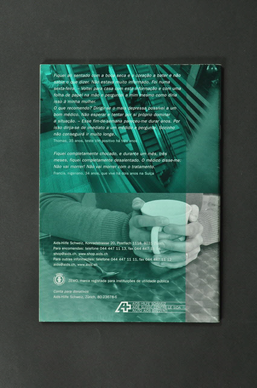 Sur la couverture en papier glacé épais, le fond est vert et divisé en quatre parties inégales : plus larges à gauche et fins bandeaux à droite. En haut, à gauche, en caractères blancs, on trouve les titres des versions française (2004.119.028), allemande (2004.119.027), espagnole (2004.119.032), anglaise (2004.119.029) et italienne (2004.119.031) de cette revue suisse. En dessous, en petits caractères noirs, il y a dans plusieurs langues une note sur le bulletin de commande de la revue. Au centre, en grands, puis petits caractères blancs il y a le titre en portugais. En sous impression en bas, il y a une photo colorée en vert d'un lavabo et une brosse à ongles. Le dos a un fond vert avec un texte imprimé en blanc en haut, ce sont deux témoignages en portugais parlant du choc de l'annonce. En bas, on trouve les coordonnées et le logo de l'association avec en sous impression verte deux mains tenant une tasse. A l'intérieur le fond est blanc et le texte est imprimé en noir et vert (témoignages et sous titres), des photos noir et blanc en vignette illustrent les propos. Au début on trouve un encart détachable : bon de commande de la brochure envoyée gratuitement et sous pli discret.Inscriptions