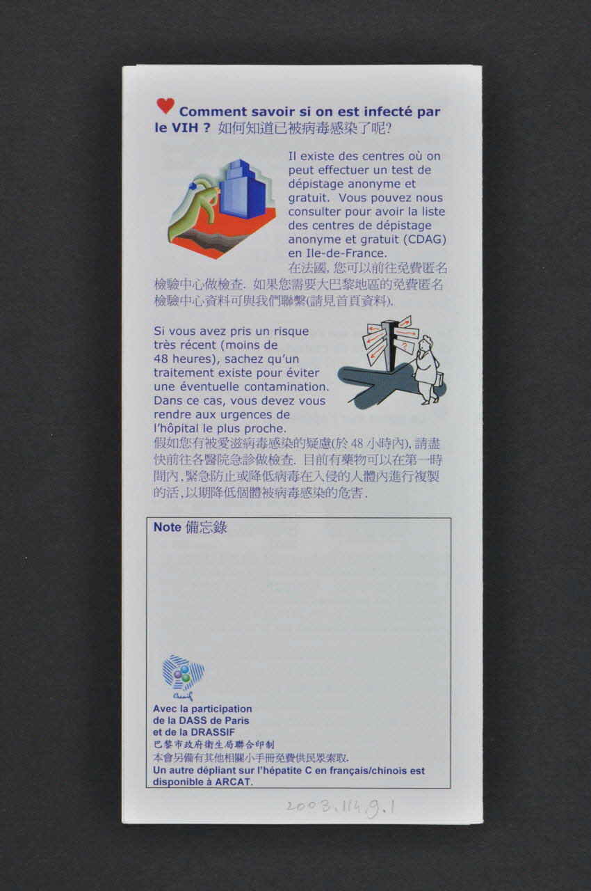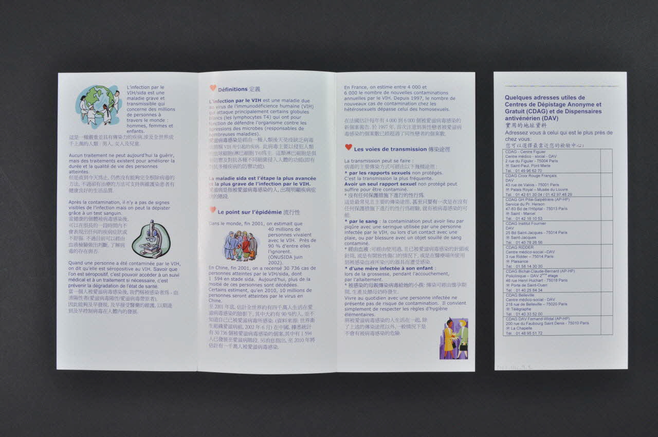 La brochure (.1 et .2) est entièrement bilingue : chinois / français. L'ensemble est imprimé en caractères bleus sur fond blanc. Dans la partie supérieure du recto du .1, les logos d'ARCAT et de groupe SOS sont inscrits. En dessous, le titre est inscrit en petites capitales italiques en français, puis en chinois. Au centre, dans un carré rouge, il y a en sur-impression quatre lignes de bonhommes "en papier" en alternance blanc et jaune. Dans la partie inférieure, les coordonnées de l'association sont mentionnées. L'intérieur se compose d'un texte avec des sous-titres en caractères gras pointés par des coeurs rouges. Des dessins colorés illustrent le contenu du texte. Le texte avec cette typographie continue sur la partie supérieure du verso.La partie inférieure se compose d'un cadre pour y inscrire des annotations. Le logo d'un partenaire y est inscrit dans l'angle inférieur gauche. Le feuillet mobile (.2) concerne les adresses des centres de dépistage et de dispensaires. La même typographie est utilisée. Au verso, on retrouve les logos de l'association et des partenaires du projet. Un dessin coloré sépare la liste des logos.Inscriptions