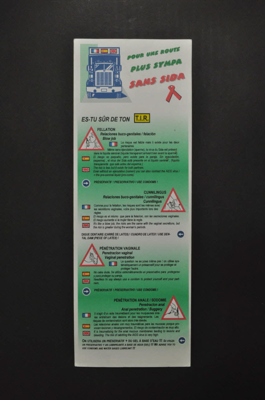 Au recto, en haut à gauche, un camion est représenté avec les drapeaux français, espagnol, anglais au-dessus du pare-brise. Une inscription en vert et rouge en biais ainsi qu'un ruban rouge figurent à côté. Sept ensembles de conseils (quatre au recto et trois au verso) sont ensuite présentés tous de façon semblable : une vignette représentant de façon schématique une pratique sexuelle à l'intérieur d'un signal triangulaire rouge, le nom de la pratique dans les trois langues, quelques phrases explicatives du risque dans les trois langues, un conseil de prévention en petites capitales noires dans les trois langues. Dans la deuxième moitié inférieur du verso figure un texte en noir et une inscription en vert accompagnée du ruban rouge dans le coin inférieur gauche. Le camion de la couverte est reproduit de dos dans le coin inférieur droit.Inscriptions