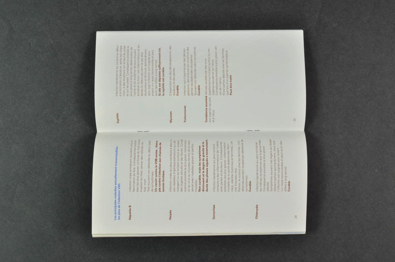 - p.5 Qu'est-ce que le sida ? // // - p.7 L'infection par le VIH // - Comment le VIH affaiblit-il le système immunitaire ? // - Comment se développe une infection par le VIH ? // // - p.10 Transmission // - Comment le VIH ne se transmet-il pas ? // - Comment le VIH se transmet-il ? (transmission sexuelle // transmission en cas de consommation de drogues // transmission mère-enfant /sang et produits sanguins // // - p.16 Informations sur l'épidémie // // - p.19 Protection : Safer Sex et Safer Use // - Comment peut-on se protéger du VIH ? Safer sex (sexe entre femme et homme // hommes ayant des relations sexuelles avec d'autres hommes // femmes ayant des relations sexuelles avec des femmes) // Hommes et femmes consommant de la drogue : safer use et safer sex // Transmission de la mère à l'enfant : mesures médicales Conditions favorisant les comportements à risque // Quand le préservatif est déchiré ou qu'il a été oublié (prophylaxie post exposition) // Existe-t-il un vaccin contre le VIH ? // - Protection contre les autres maladies sexuellement transmissibles (symptômes / // les principales maladies : hépatite B , herpès, gonorrhée, chlamydia, syphilis, mycoses, trichomonas, condylome acuminé) // // - p.31 Le test de dépistage du VIH (volontariat) // a consultation du test // Test négatif - tout va pour le mieux ? // Test positif - que faire ? // // - p.39 Quels sont les traitements médicaux possibles // // - p.43 Le VIH/sida et la société // La société et les personnes concernées : discriminations et exclusions (les personnes homosexuelles, les consommateurs de drogues / les personnes en prison // - De quoi a-t-on besoin ? La politique en matière de drogue // Régime pénitentiaire // Politique de migration // // - p.48 Consultation et soutien // (adresses associatives et institutionnelles utiles) (page 1 en haut), à l'intérieurDécor