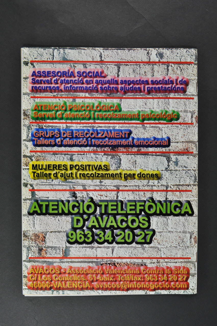 Au dos de la revue, sur le dessin d'un mur, figurent des bandeaux de couleur avec les activités de l'association en bleu sur rose (assistance sociale), orange sur vert (assistance psychlogique), rose sur bleu (groupes de parole), noir sur jaune (femmes positives), jaune sur rose (coordonnées de l'association) et en gros, vert sur gris, ligne téléphonique.