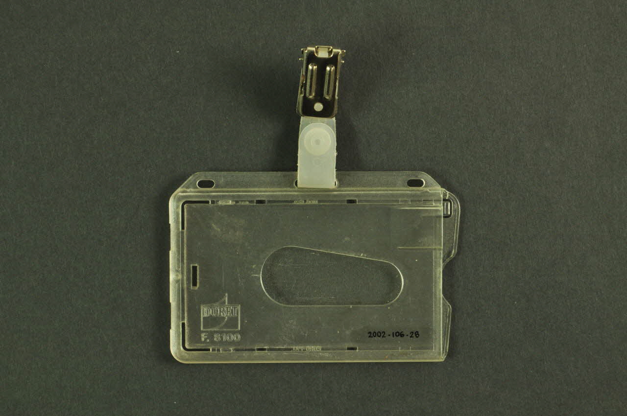 Porte‑badge constitué d'un étui rectangulaire en matière plastique incolore, ouvert sur une largeur. Une petite pince métallique reliée à l'étui par une courte lanière de plastique permet l'accroche du porte‑badge.Un évidement de forme oblongue est présent au centre de la face arrière de l'étui ; un logo en relief figure dans l'angle inférieur gauche de cette même face.Décor