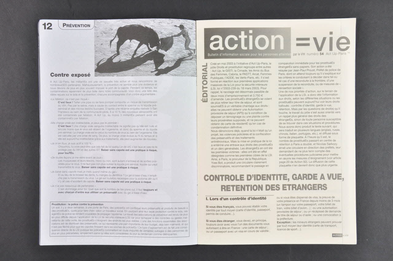 - Editorial de Jérôme Martin :"L'autre guerre" : les actions de l'association sur tous les plans - Reproduction du tract : "Tout régresse sauf le sida" (grandes capitales blanches sur fond noir) - React Up : appel à la manifestation du 1er décembre (en blanc sur fond noir) - Dossier : Cibles : le point sur les personnes et les structures qui sont en priorité dans notre ligne de mire : Jacques Chirac, les parlementaires, le gouvernement, l'INPES et la DGS, les médias (en blanc sur fond noir et en noir sur fond gris - Act Up-Paris et l'action publique - Appel à dons - Reproduction du tract :React / Up. Manifestation le 1er décembre. "Une recherche soucieuse de la vie et du bien-être des malades / une épidémiologie à la mesure de la pandémie / une prévention affichée, ciblée, aux effets enfin tangibles / l'accès aux génériques et à une prise en charge globale pour les séropos des pays du sud / l'amélioration et la protection effectives et publiques des droits des minorités / l'égalité entre homos et hétéros en droit comme en fait / la libération sans condition des malades en détention / des revenus décents pour chacunE d'entre nous". En dessous, logo de l'association. - Liste d'idées reçues sur le sida : Leit motiv :"Baiser sans capote est une pratique à risque pour touTEs" Au centre. Encart sur pages jaunes, impression en noir et en gris. "Action = vie. Bulletin d'information sociale pour les personnes atteintes par le VIH. Numéro 54. En dessous, titre de l'encart :"Contrôle d'identité, garde à vue, rétention des étrangers". - "Avec ce Label, vos établissements s'engagent". 2003-2004. "Liste des établissements signataires de la charte de responsabilité" : "Les établissements sélectionnés par le collectif associatif (SNEG, Act Up-Paris, AIDES, Sida Info Service) adhèrent à la charte de responsabilité. Ils achètent et vous offrent préservatifs et gels mis à votre disposition dans les parcours sexuels. Protégeons-nous" - Appel à la RéPI : "La prise en charge extra-VIH, quels parcours dans l'hôpital ?" - Appel à la RéPi :"Usage de drogues et antirétroviraux, que sait-on des interactions ?" - Accord de libre échange Maroc- Etats Unis : une condamnation à mort pour les malades (monopoles de l'industrie pharmaceutique) - Brèves Nord-Sud (en blanc sur fond noir) : Génériques : le Canada hésite à choisir son camp / GSK et Boehringer condamnés en Afrique du Sud / Bill Clinton se lance enfin dans la bataille pour l'accès aux génériques - Aide médicale de l'Etat : François Fillon introduit la préférence nationale - Dominique Versini menteuse, raciste, promotrice de la misère (zap aux Etats Généraux d'ELCS) - La méthode Sarkozy en matière de lutte contre la prostitution - Prison = mort. Suspension de peine : une loi vidée de sa substance