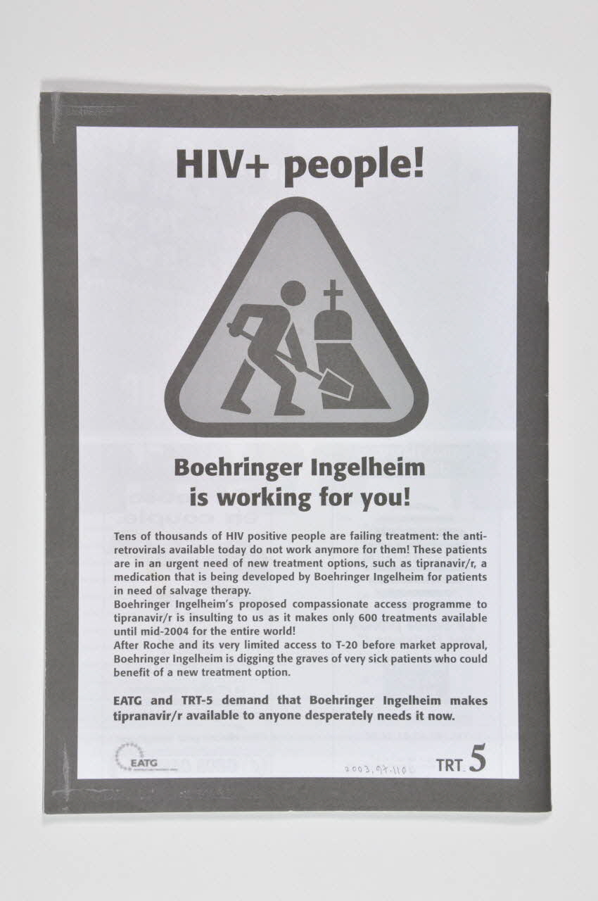 Le dos comprend un panneau indicateur de forme triangulaire représentant un homme creusant une tombe. Du texte est imprimé en noir sur fond blanc dans la hauteur de la page. Une bordure noire encadre l'ensemble. Il s'agit d'une reproduction d'un tract en anglais provenant de EATG et TRT 5 contre le laboratoire Boehringer qui réduit l'accès au tipranavir aux malades en échec thérapeutique qui en ont un besoin urgent. A l'intérieur, le texte est imprimé en noir sur blanc ou en blanc sur noir. Certaines pages comprennent des photographies ou des illustrations toujours en noir et blanc. Au centre de la revue, quatre pages sont imprimées en noir sur du papier jaune plus épais et correspondent au bulletin mensuel destiné aux personnes atteintes par le VIH.Inscriptions