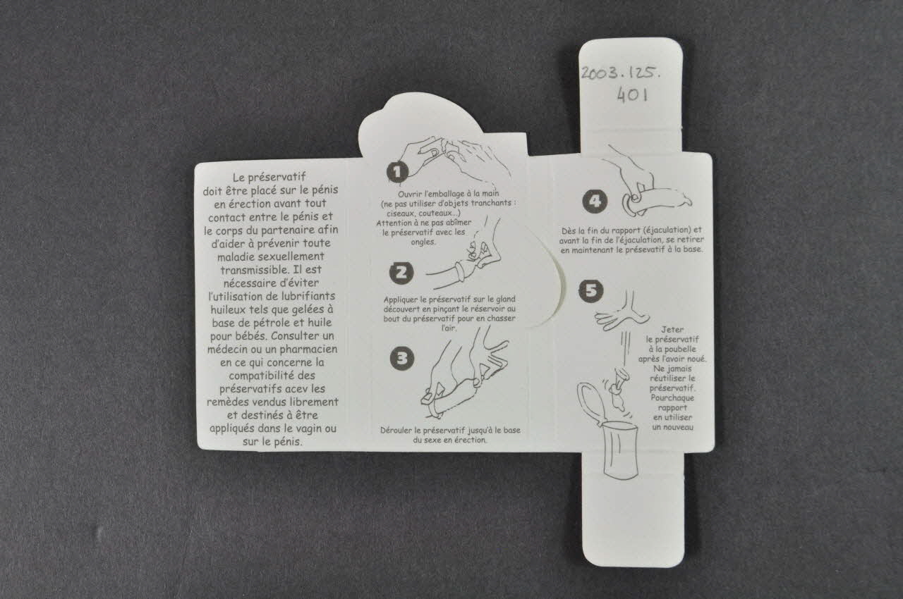 Le préservatif // doit être placé sur le pénis // [...] (Sur l'ensemble de la face: à gauche et en légende sous les schémas explicatifs. Lettres noires sur fond blanc.), à l'intérieurConcernant le lieu d'édition, marque, concernant le lieu d'exécution, nom de société, adresse