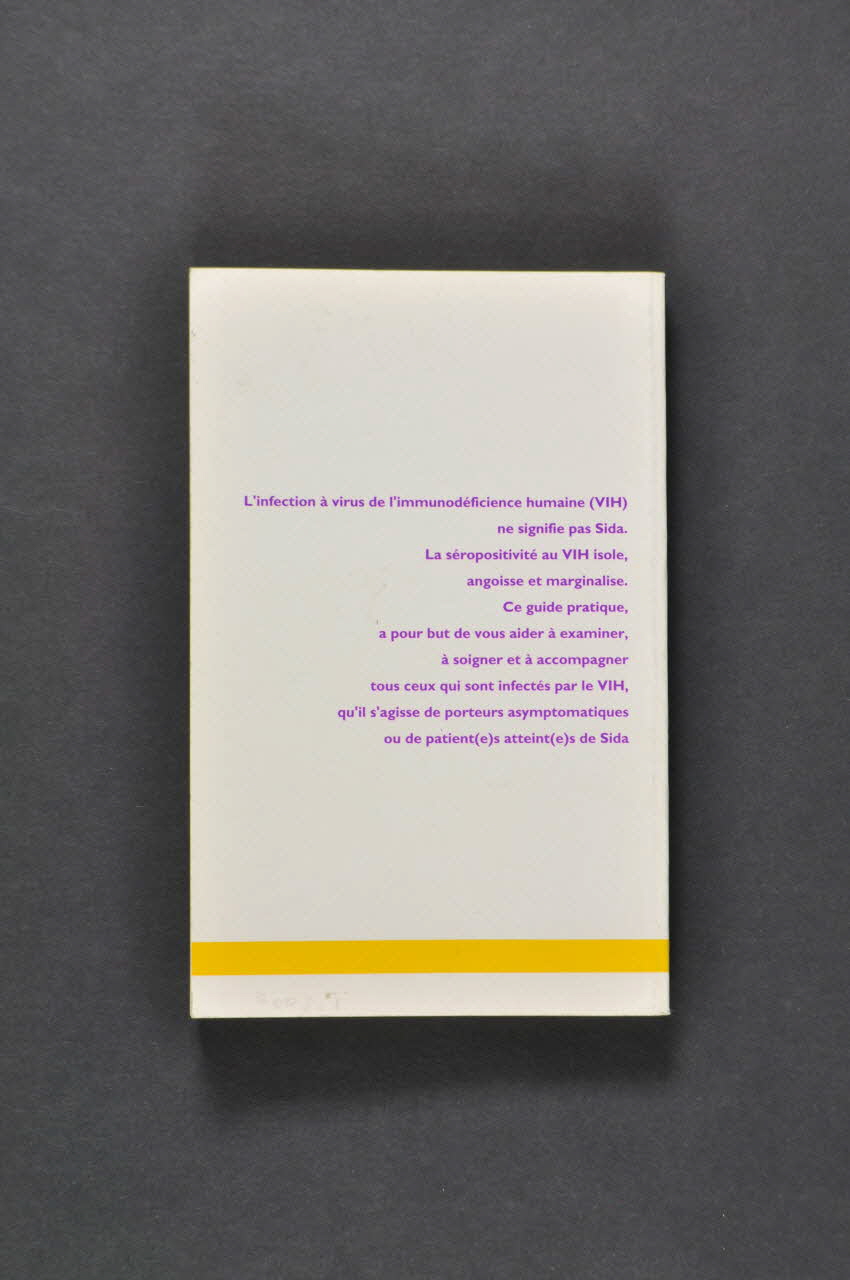 Livre de 201 pages à couverture souple. Fond blanc avec motif de spirale violette et jaune. Au dessus de l'illustration, en lettre violettes, titre, sous-titre et édition : "SIDA 1993. L'infection par le virus de l'immonudéficience humaine en pratique médicale quotidienne. 3e édition - janvier 1993". Sous l'illustration, bandeau jaune avec logos de AIDS, ENSP éditeur, UNAFORMEC.