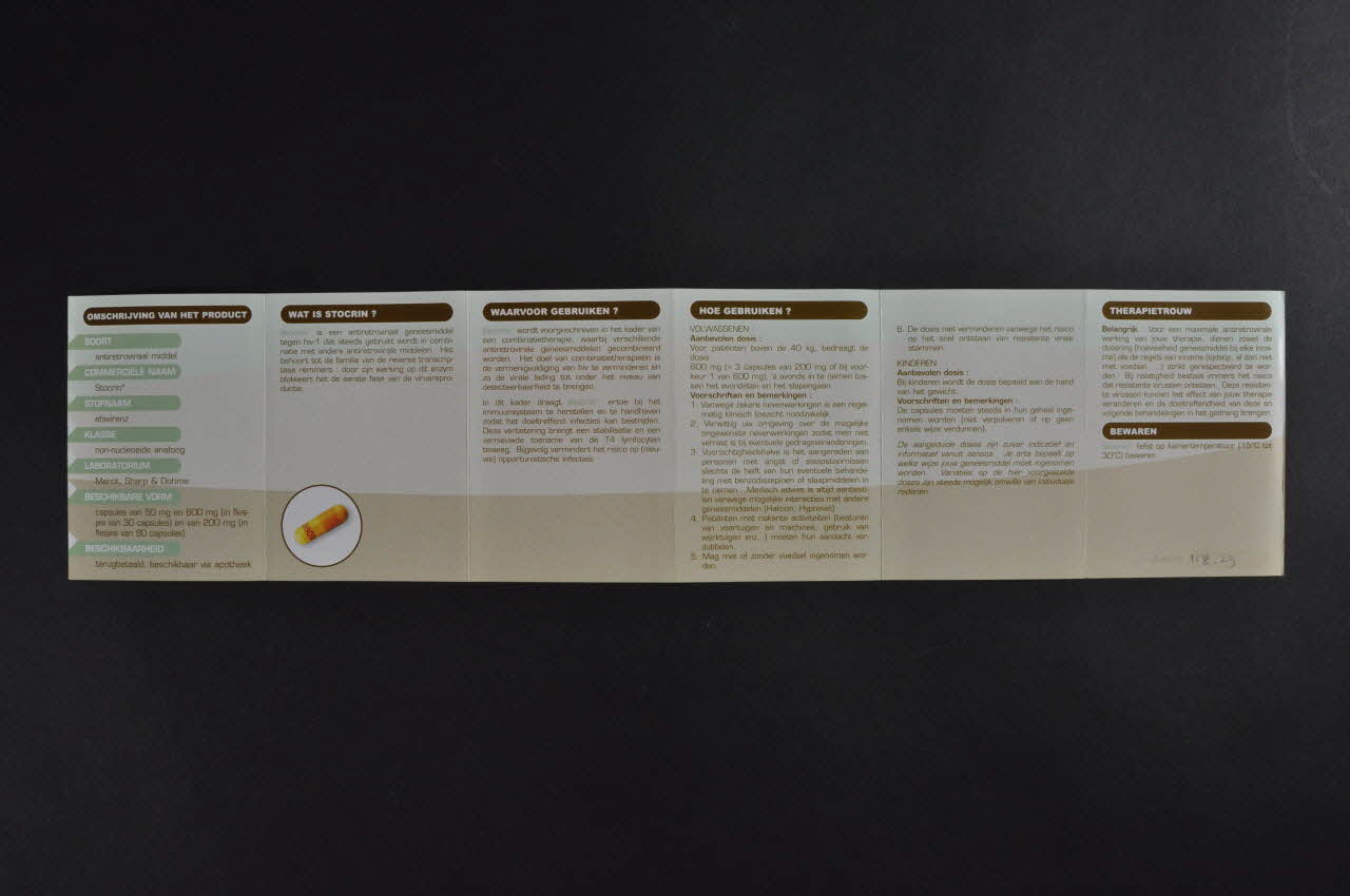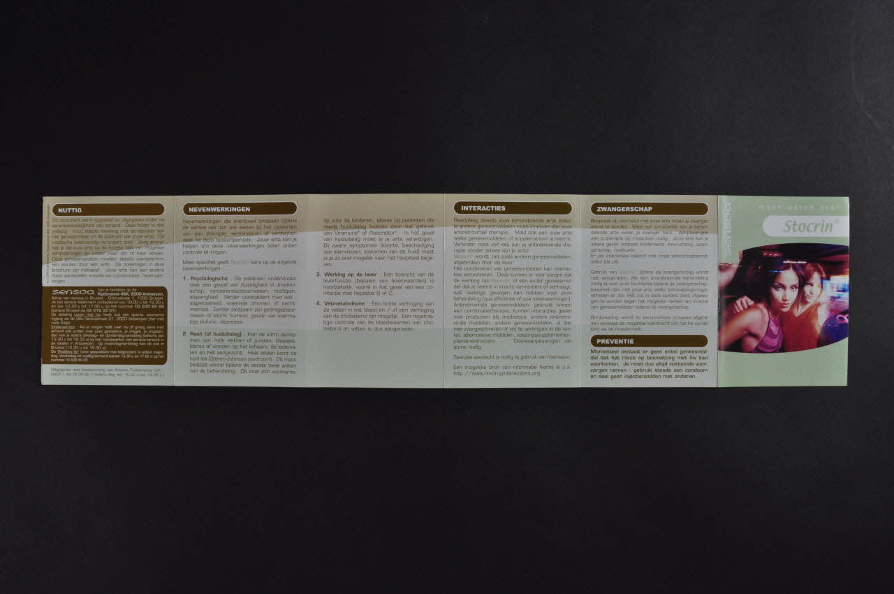 Meer weten over Stocrin (En savoir plus sur Stocrin) (Titre du dépliant en haut de la couverture.)OMSCHRIJVING VAN HET PRODUCT // WAT IS STOCRIN ? // WAARVOOR GEBRUIKEN ? // HOE GEBRUIKEN ? // VOORZORGEN BIJ GEBRUIK // THERAPIETROUW // BEWAREN // NUTTIG // NEVENWERKINGEN // INTERACTIES // ZWANGERSCHAP // PREVENTIE (Titres des rubriques du dépliant.)sensoa (Nom de l'association écrit en blanc dans un cartouche en haut à gauche de la couverture.)Décor