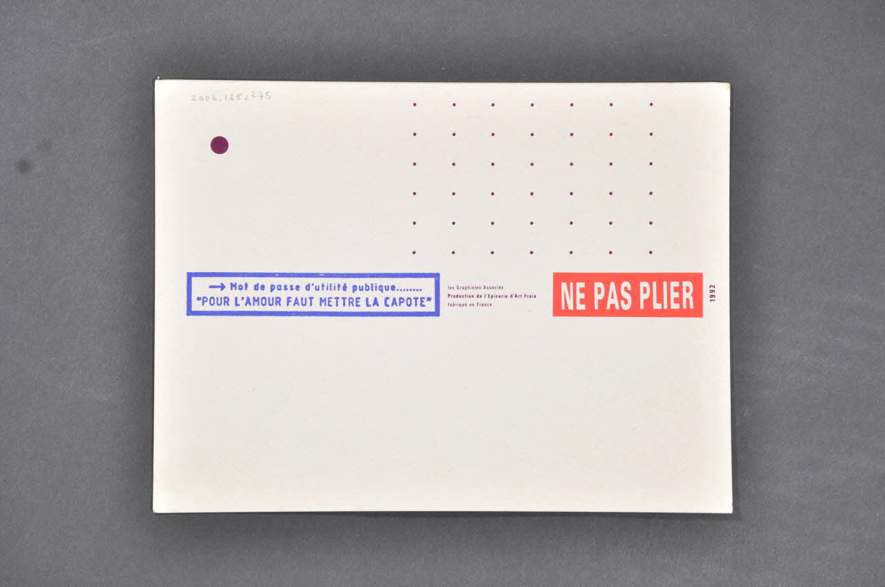 LE PETIT // CHAT EST // MORT ! (inscrit en marron, dans la bulle), rectoNe pas plier (en lettres majuscules blanches, dans le rectangle rouge), versoMot de passe d'utilité publique...... // "POUR L'AMOUR FAUT METTRE LA CAPOTE" (dans l'encadré bleu), versoAuteur
