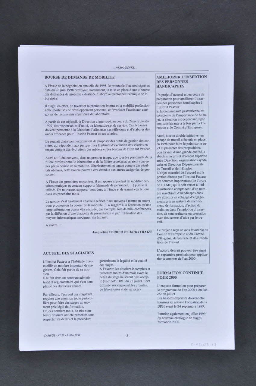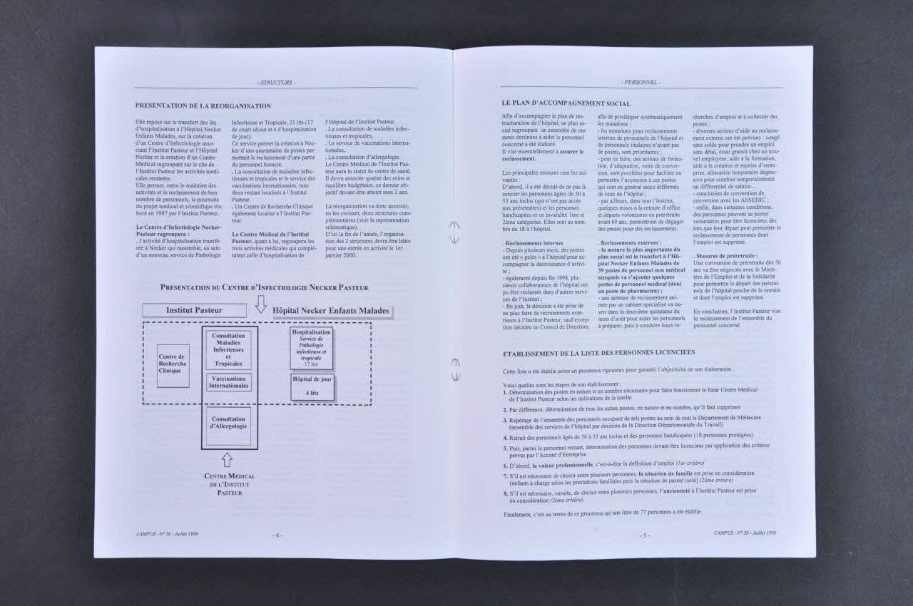 journal, Journal interne de l'Institut Pasteur, n° 38, juillet 1999 / La réorganisation de l'hôpital, Campus