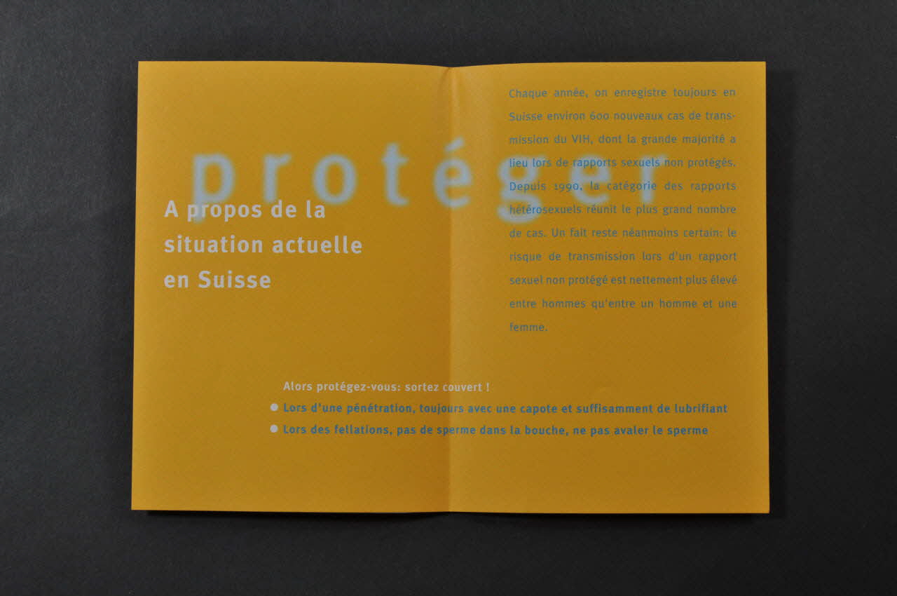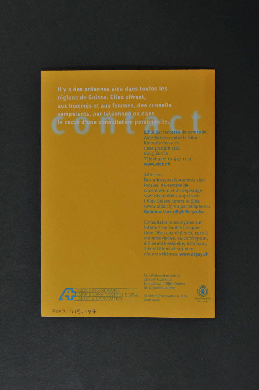 AIDS-HILFE SCHWEIZ // AIDE SUISSE CONTRE LE SIDA // AIUTO AIDS SVIZZERO (logo en bleu dans le coin inférieur gauche au dos du dépliant), versoDécor
