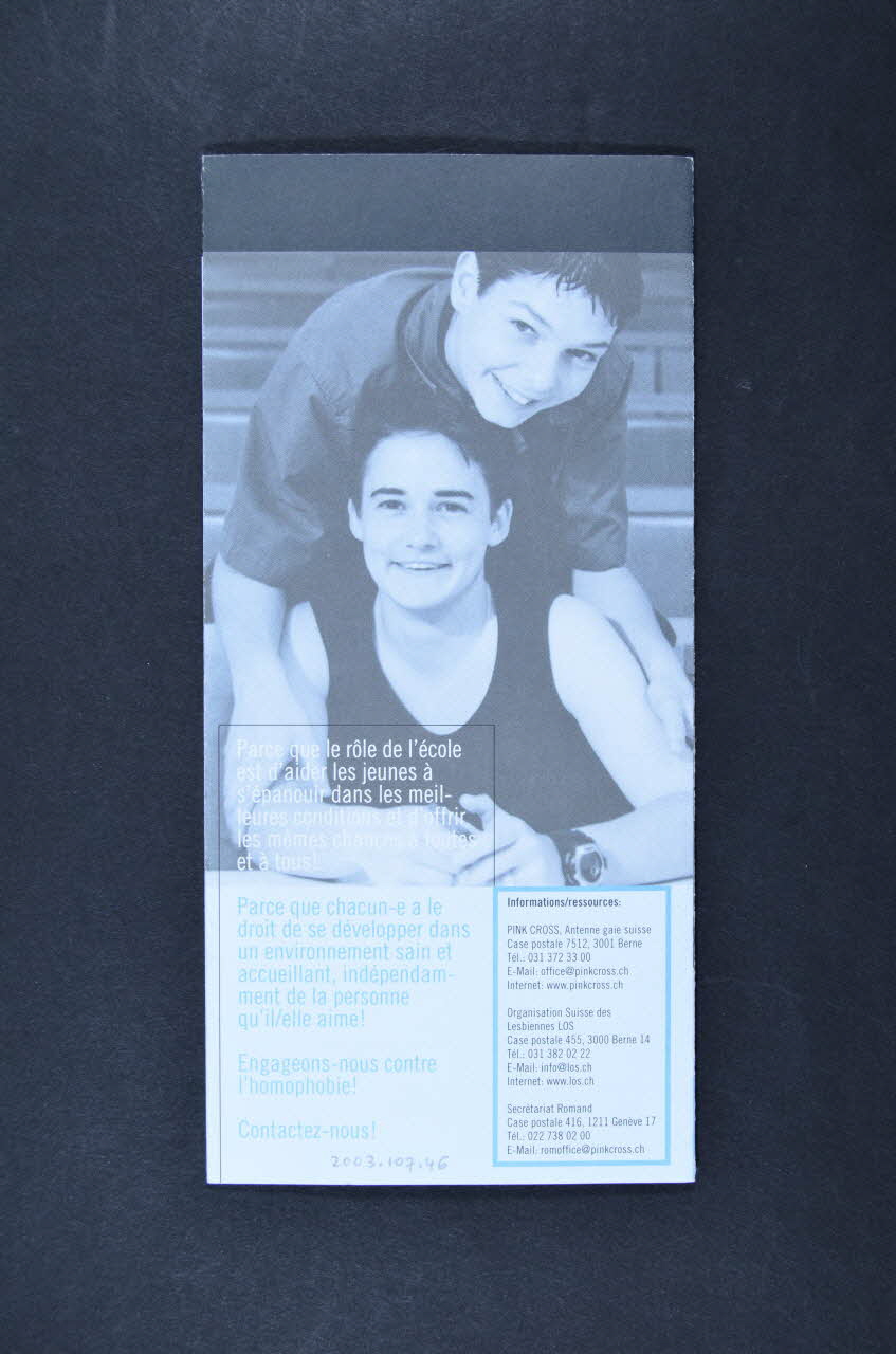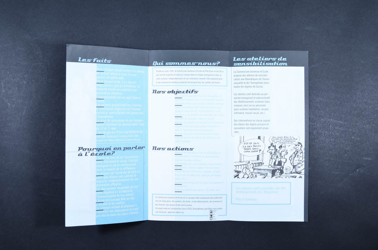 La couverture est composée autour de la photographie noir et blanc de deux jeunes garçons, vus de face, tête contre tête.Des inscriptions en blanc et en bleu en haut et en bas de l'image. Quatre logos figurent dans une bande bleue en bas. Le dos du dépliant comporte une photographie noir et blanc de deux jeunes filles enlacées. Un texte blanc, noir et bleu se trouve en bas de la photographie. L'intérieur du dépliant est pourvu d'un texte en blanc, noir et bleu. Les titres sont en gros caractères bleus et noirs. Sur chaque haut de page, se trouve une bande noire. Le feuillet 3 contient une vignette humoristique en noir et blanc montrant une enseignante en train de donner un cours à de jeunes enfants.Inscriptions