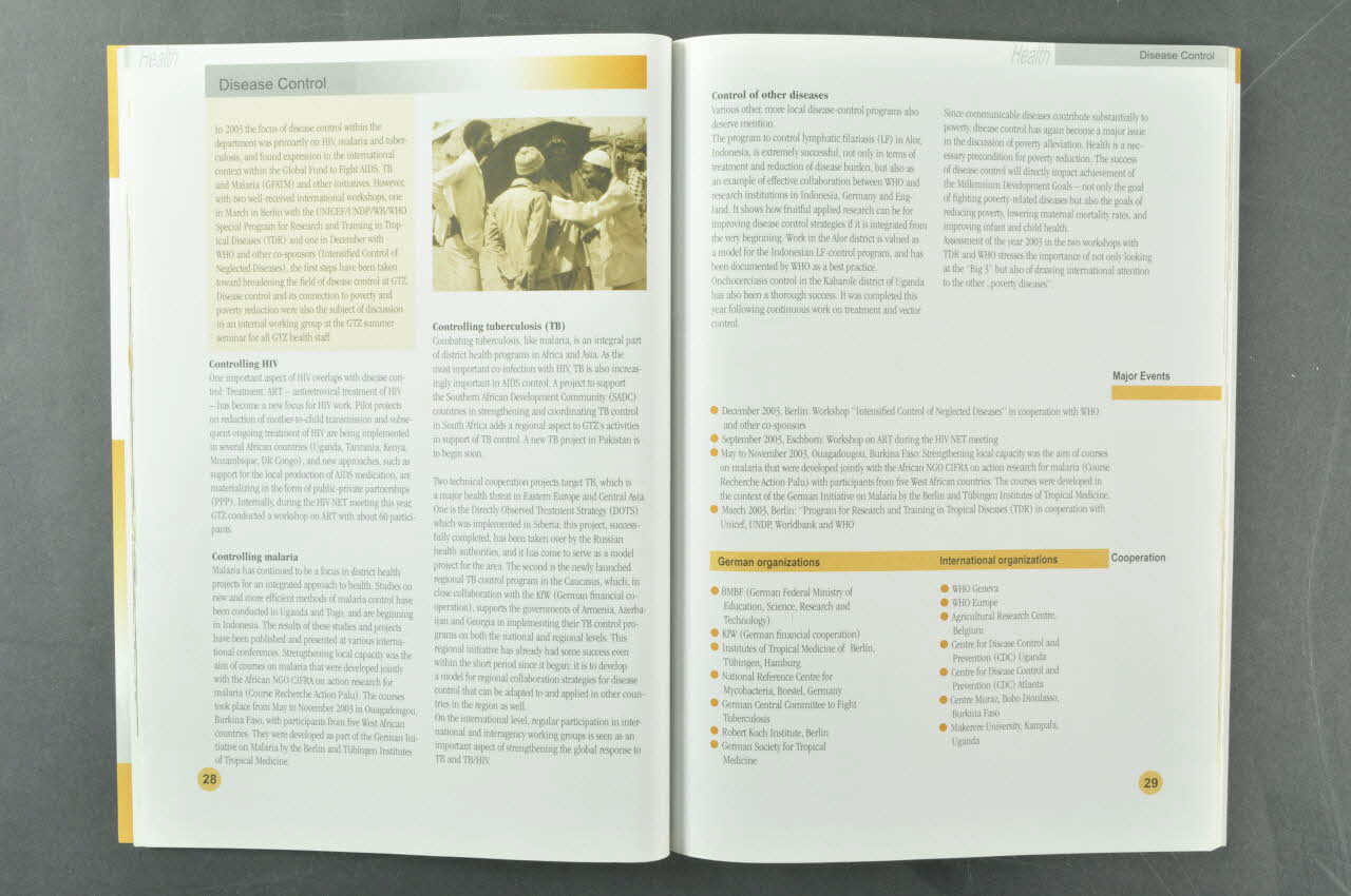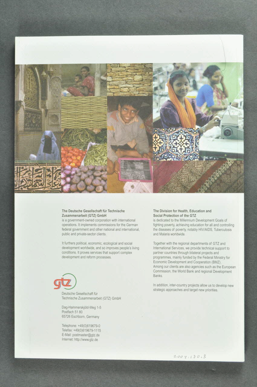 La couverture à fond blanc cassé présente, en haut, un bandeau composé de douze vignettes de différentes dimensions, figurant des photographies liées à des thèmes et actions décrits dans le texte. En dessous, en caractères noirs se trouve le titre. En bas sont imprimés les logos de la "division of Health, Education and Social protection" et de la "Deutsche Gesellschaft für Technische Zusammenarbeit" (GTZ)