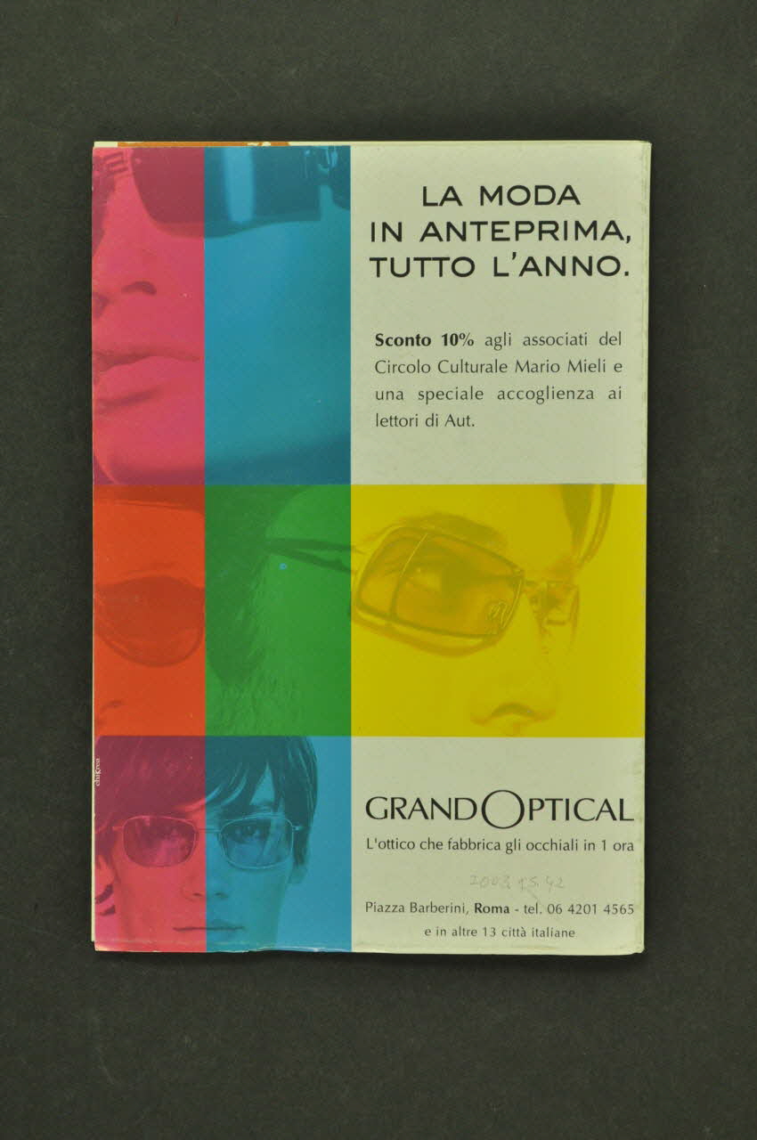 LA MODA // IN ANTEPRIMA, // TUTTO L'ANNO // // Sconto 10% agli associati del // Circolo Culturale Mario Mieli e // una speciale accoglienza ai // lettori di Aut. // // GRANDOPTICAL // L'ottico che fabbrica gli occhiali in 1 ora // // Piazza Barberini, Roma - tel. 06 4201 4565 // e in altre 13 città italiane (Sur la quatrième de couverture, imprimés en noir sur blanc.), versoRoma pride 2003 // Il documento politico // // Torino gay // Il fastical compie 18 anni // // Vittorio Agnoletto // Perchè sono // contro la globalizzazione // // Yossi & Jagger // il bacio che ha spopolato in Israele (Sur la première de couverture, dans l'angle supérieur droit, en caractères jaune et orangé. // // Et dans la partie inférieure du recto), rectoTexte, date