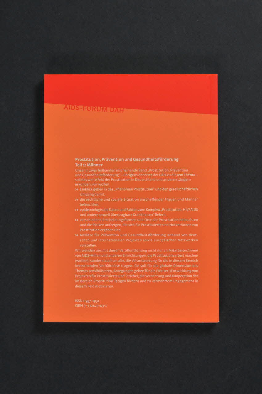 "AIDS-FORUM DAH. Band 45". DAH représente les initiales de l'association : Deutsche AIDS-Hilfe. Il s'agit d'une collection de livres de recherche : colloques ou études éditées par l'association. En dessous, en biais, une photo stylisée séparant le bandeau supérieur de la zone de titre "Prostitution, Prävention und Gesundheitsförderung. Teil 1 : Männer" (Prostitution, prévention et encouragement à la santé. Volume 1. Les hommes). Sous le titre, nom de l'auteur : M.T.Wright (Hrsg). Dans l'angle inférieur gauche, logo de l'association.