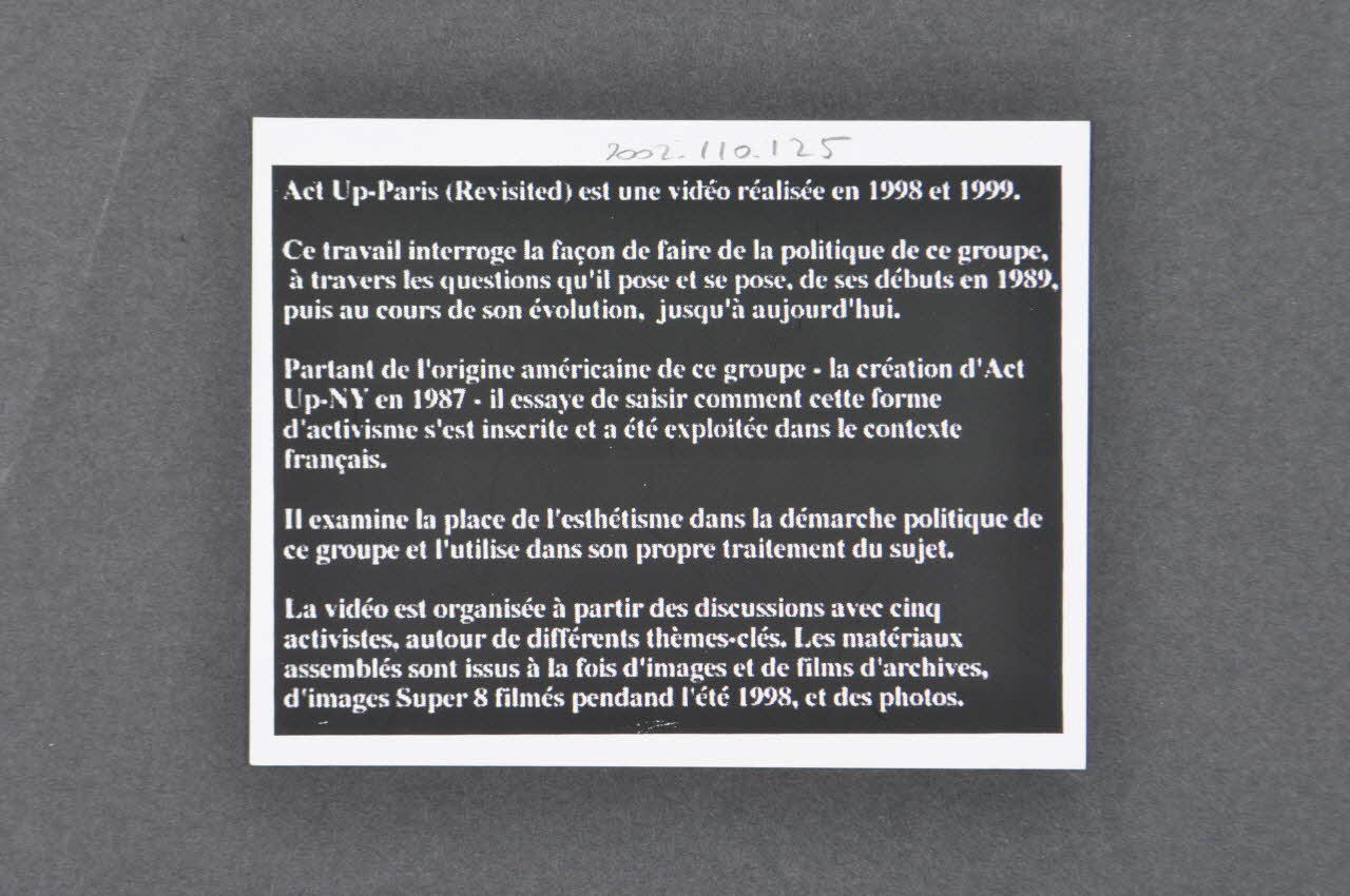 Act Up-Paris (Revisited) est une vidéo réalisée en 1998 et 1999. // Ce travail interroge la façon de faire de la politique de ce groupe, [...] Les matériaux assemblées sont issus à la fois d'images et de films d'archives, d'images Super 8 filmés pendant l'été 1998, et des photos. (Seul le début et la fin du texte sont transcrits), versoune video de 50 minutes sur la trajectoire d'Act Up, de ses débuts à aujourd'hui. // (a 50 minute video exploring HIV/AIDS activism in Paris) // projection à la médiathèque, ensb-a // le mardi 4 mais à 14h30 // (en présence de Laura Davis), // le jeudi 6 mai à 16h30, rectoDécor