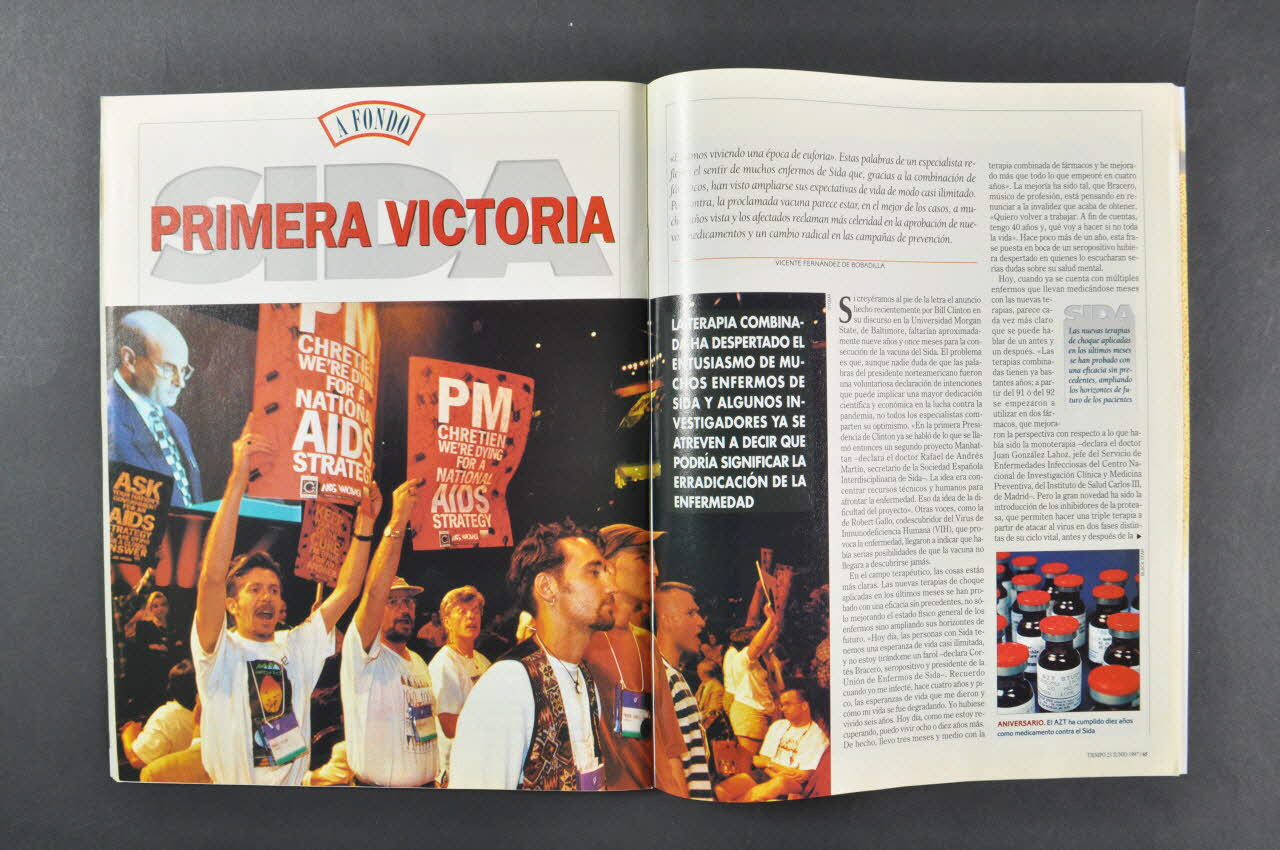- Sida. Première victoire. Sous titre "Le thérapie combinée a provoqué l'enthousiasme de beaucoup de malades du sida et quelques chercheurs se permettent de dire que cela pourrait signifier l'éradication de la maladie."