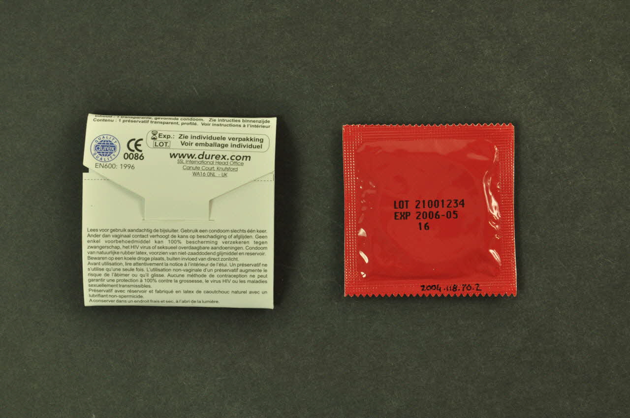 durex® // // LOT 21001234 // EXP 2006-05 // 16 (Sachet individuel du préservatif. Sur fond rouge.), dessusDécor