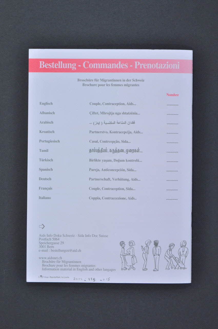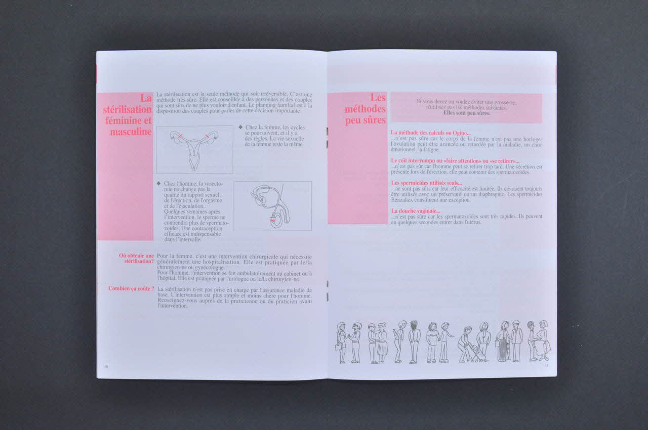 11 éditions en langues différentes de la brochure : anglais (2004.119.023), albanais, arabe, croate (2004.119.018), portugais (2004.119.016), tamoul (2004.119.020), turc (2004.119.017), espagnol (2004.119.019), allemand (2004.119.014), français (2004.119.015), italien (2004.119.024) Sommaire - p.2 Les organes génitaux de la femme (schéma anatomique) - p.4 Les organes génitaux de l'homme (schéma anatomique) - p.5 La contraception (différentes méthodes dont le préservatif féminin) - p.13 Vos droits (prise en charge...) - p.14 Les maladies sexuellement transmissibles - p.16 Le Sida (comment le virus se transmet-il / comment éviter la transmission / comment détecter l'infection à VIH / moded d'emploi du préservatif masculin - p.18 La grossesse - p.20 L'interruption de grossesse