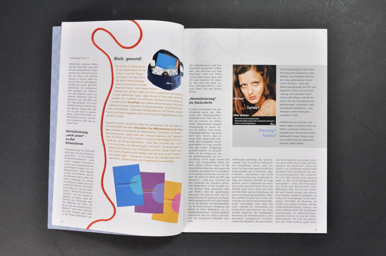 Rapport présentant les diverses activités de l'association en 2002 sous plusieurs chapitres : - Changements relatifs au sida (vivre avec...) - Globalisation, le sida dans le monde - Vivre avec - Les traitements - Consultations et soins - Santé sexuelle des hommes et des femmes - Vivre homosexuel aujourd'hui - Vivre avec les drogues - Sponsors- - Rentrées d'argent - Publications de l'association - Fonctionnement de l'association - Les Aids Hilfe en Allemagne A l'intérieur de ces chapitres, des affiches, dépliants, brochures... acquis pour le musée en 2003 sont commentés. Il s'agit des objets : 2003.111.064 (paar weise), 2003.111.015 à 019, 2003.111.021 (Positiv leben) ; 2003.111.22 (Piercing ? Tattoo ?) ; 2003.111.189 (AIDS-Forum Band 42) ; 2003.111.071 et 072 (Brochures HIV und AIDS en allemand et en russe) ; 2003.111.201 (Brochure Positive Begegnungen) ; 2003.111.200 (Brochure Dokumentation) ; 2003.111.167 (Dépliant Und wo bleibe ich) ; 2003.111.165 (Dépliant Kinder mit HIV/AIDS) ; 2003.111.166 (Dépliant Mein kind ist HIV-infiziert) ; 2003.111.164 (Dépliant In Sachen Liebe...) ; 2003.111.007 (Affiche HIV/AIDS Beratung) ; 2003.111.199 (Brochure Statisches Auswertungssystem) ; 2003.111.042 (Affiche Bewusst sein) ; 2003.111.003 (Affiche I care di you?) ; 2003.111.023 (Affiche A B C) ; 2003.111.109(Schwule sind richtige Männer) ; 2003.111.133 (Queer gegen rechts) ; 2003.111.041 (Heimat Szene?) ; 2003.111. 063 (Brochure Rausch und Risiko) ; 2003.111.065 (Es liegt in deiner Hand) ; 2003.111.062 (Sex Party) ; 2003.111.191 (Brochure AIDS Forum, Band 43) ; 2003.111.053 (Drogenkonsum und Hepatitis) ; ; 2003.111.214 (Safer use und safer sex..) ; 2003.111.039 (JES)