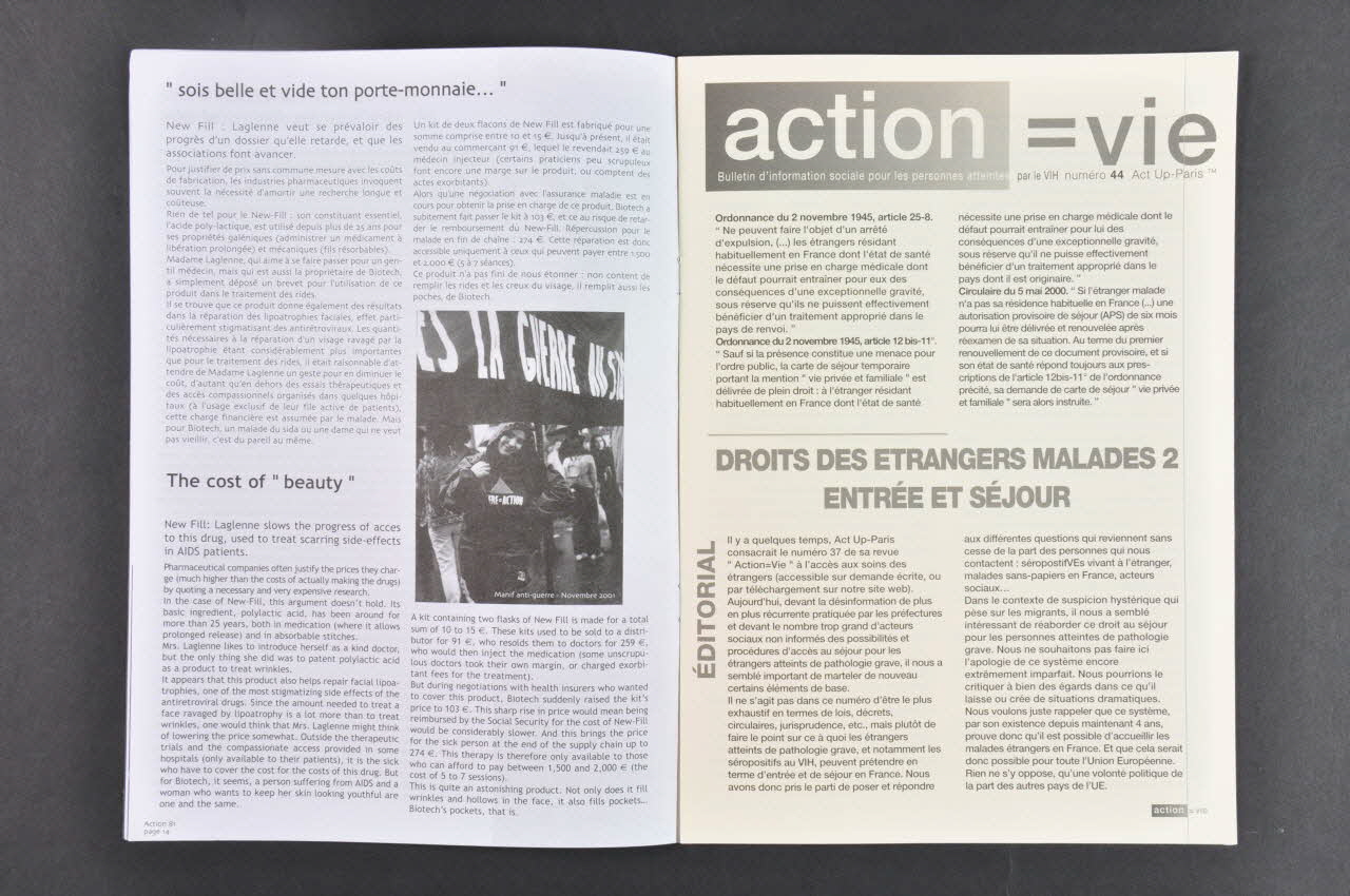 Précisions sur le contenu : Editorial en français de Victoire Patouillard . Enjeux de la conférence : accès aux traitements dans les pays pauvres, essais sur les effets secondaires. - p. 4 "Sida et G8 : où sont les 10 milliards de US $" (illustration : autocollant "Cheap Aids drugs for all") - p. 5 " Stop medical apartheid" Donner l'argent promis par les pays riches) - p. 6 "Accelerating Access. L'OMS compromet la survie des malades" - p. 7 Antirétroviraux : comparaison des prix les plus bas proposés dans les pays dits en développement - p. 8 Criminalisation : Stop "La criminalisation des personnes séropositives va à l'encontre d'une politique de prévention efficace et d'une responsabilisation des pratiques. Ne serait-ce que pour cette raison, nous nous y opposons catégoriquement" - p. 10-11 L'industrie pharmaceutique à la conquête de l'Europe - p. 12-13 Des études post AMM pour une meilleure qualité de vie (évaluation des effets secondaires) - p. 14 "Sois belle et vide ton porte monnaie" (prix du New Fill) - Encart "Action = vie" : Droits des étrangers malades 2. Entrée et séjour - p. 15 Permanence sociale et juridique - p. 16-17 La France préfère laisser à leur sort les pédés persécutés (La France n'accorde pas le droit d'asile aux homosexuel(le)s persécuté(e)s dans leur pays, pas plus qu'elle ne condamne ces persécutions) - p. 18 -20 L'insécurité des minorités - p. 21-2 Différentes ! Pas d'études sur les effets secondaires chez les femmes - p. 24-5 Sexe : de la prévention, pas de réduction des risques ("Que les risques soient minimes ne change rien à l'affaire. Ils existent, et le seul moyen de les éviter est d'utiliser une capote ou une digue dentaire. Il n'y a pas de vaccin, pas d'autres moyens de se protéger." (Désaccord avec l'association AIDES qui donne des conseils de moindre risque (flyers entrés dans la collecte)