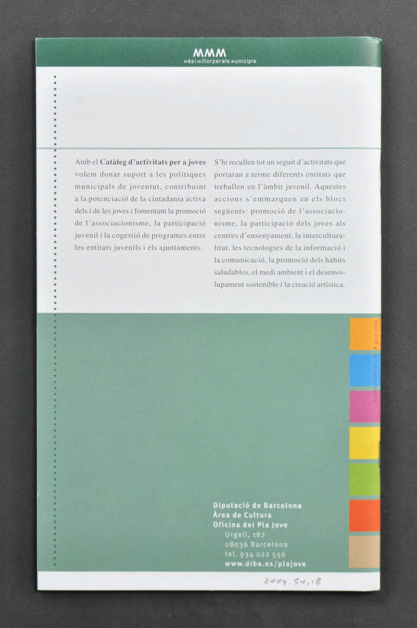 La dernière de couverture est paginée de manière presque identique. Sur le fond blanc un texte présente le catalogue et en bas sur fond vert, figurent les coordonnées de la Diputacio de Barcelona.