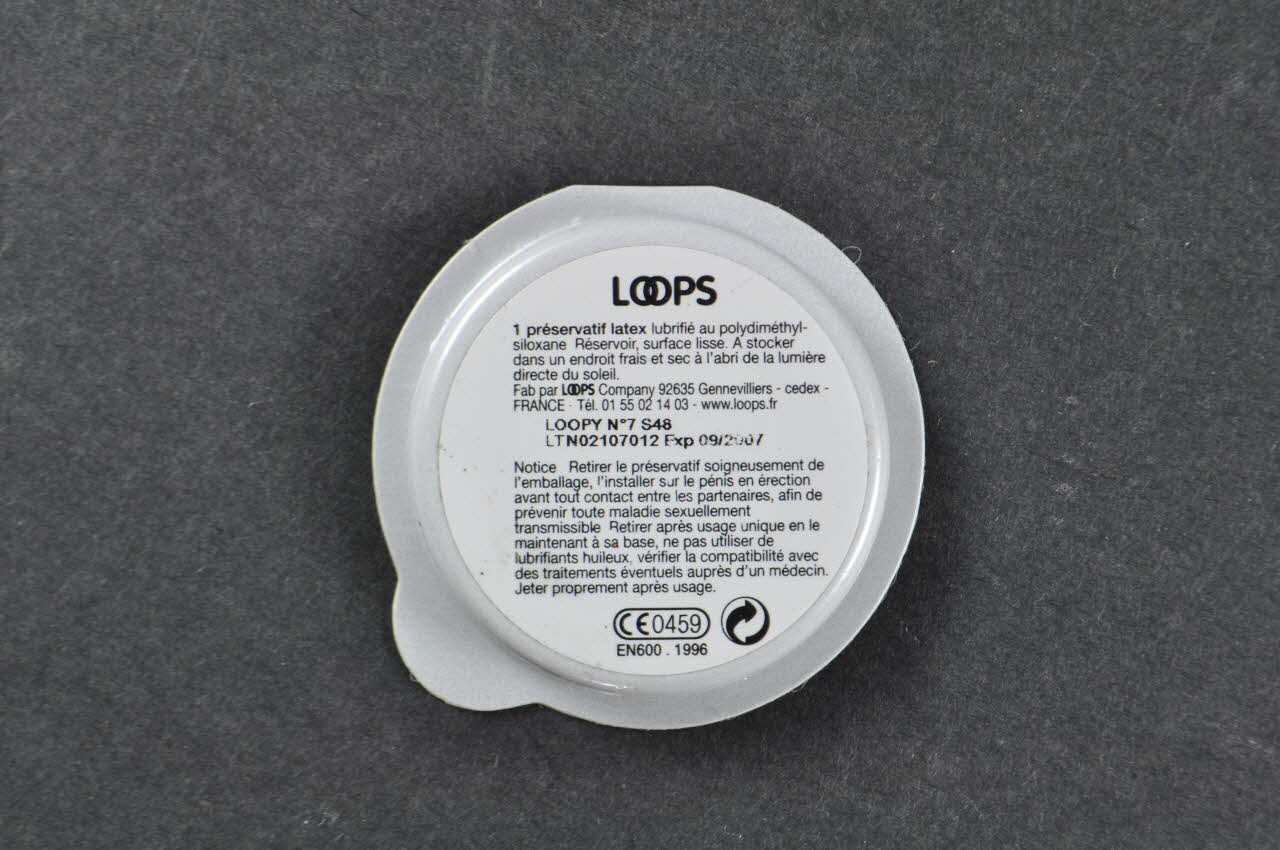 Un préservatif est rangé à l'intérieur.Inscriptions