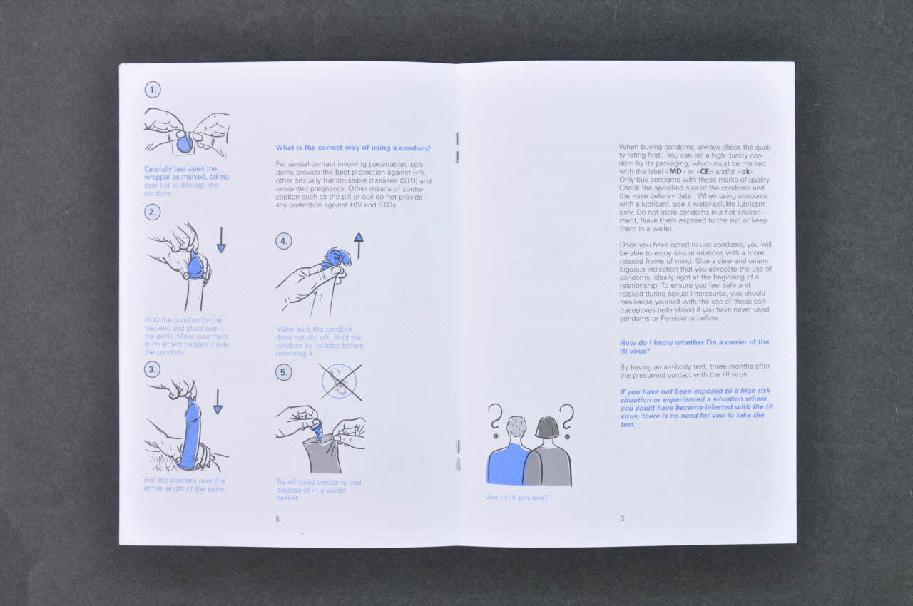 La couverte est sur fond bleu et inscrite d'un titre en caractères blancs en haut à droite. Elle est illsutrée de trois vignettes en noir et blanc représentant un couple nu, une injection dans un bras et une femme enceinte, les modes de transmission (couple hétérosexuel, injection, grossesse). En bas, à gauche e cractères blancs figurent quatre groupes d'initiales. Le dos est sur fond bleu et sans inscription. L'intérieur est sur fond blanc, avec des textes en caractères noir et bleus et de nombreuses illustrations de vignettes.Inscriptions