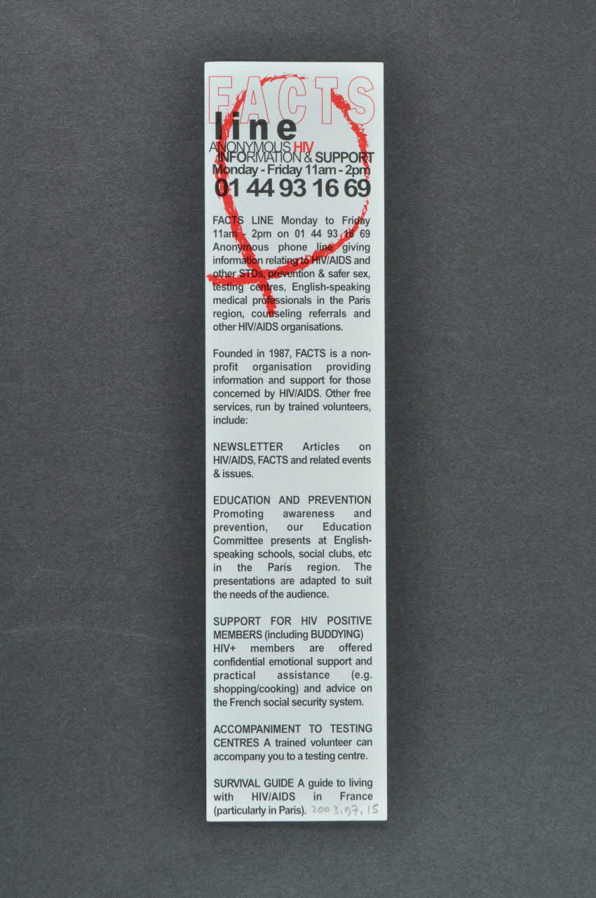 De format rectangulaire allongé, le signet présente un fond blanc. Le recto montre deux traits courbes rouges avec un titre en noir et en blanc cerné de rouge. Sur la gauche se trouve un petit texte noir.