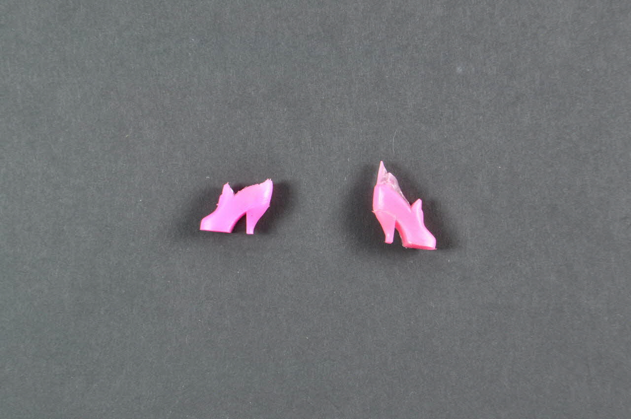 La poupée porte des bas résille noir. Une paire de souliers en plastique rose est associée à la poupée.