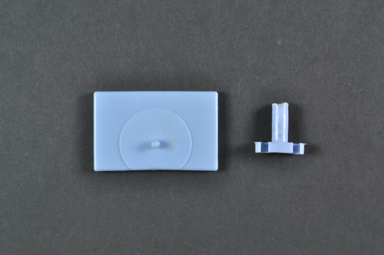 La poupée mannequin peut se fixer sur un socle en plastique bleu rectangulaire, auquel elle est maintenue grace à deux crochets se plaçant autour des jambes.