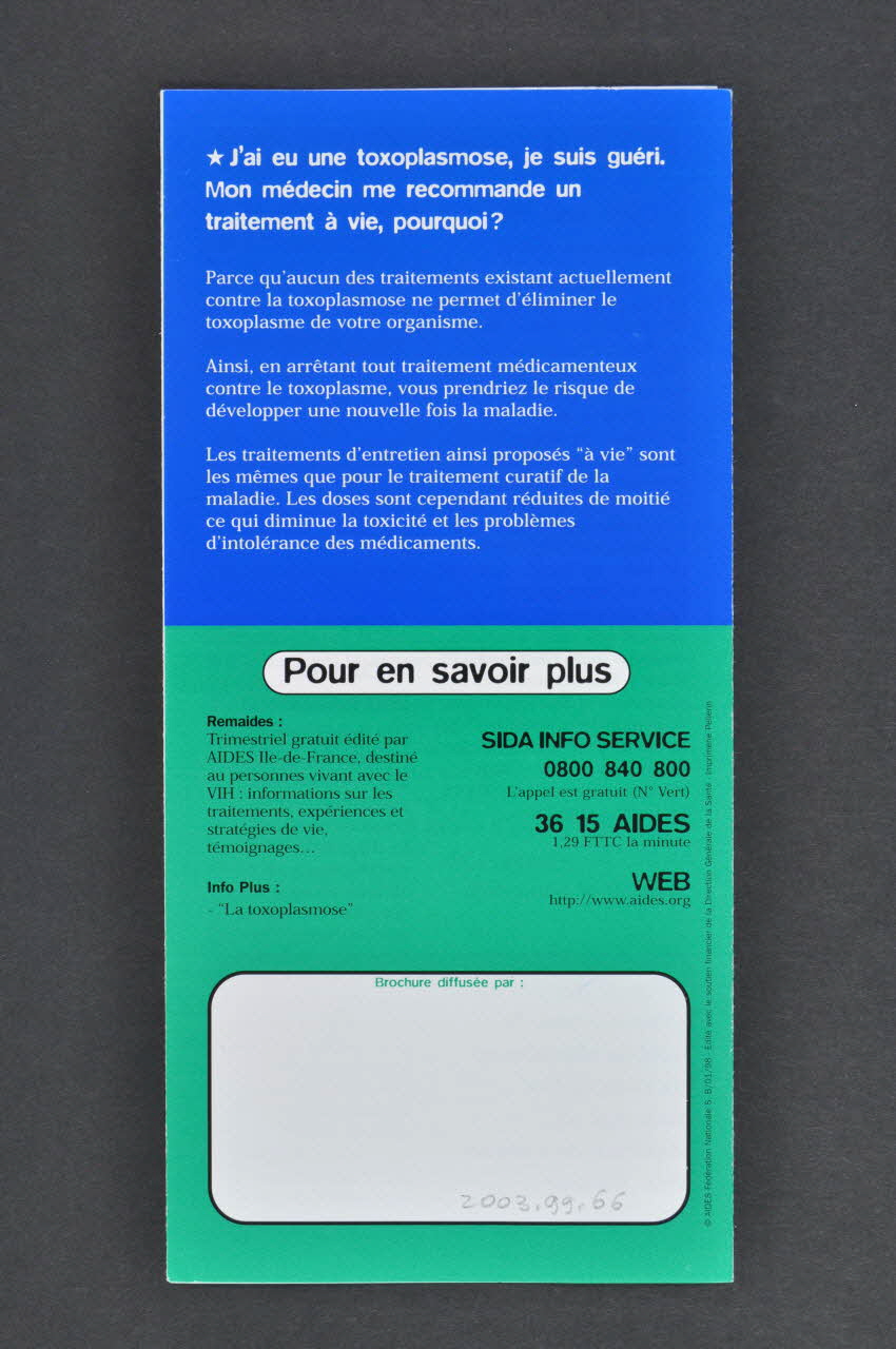 Double de 2003.100.25 Sur la couverture : "La toxoplasmose". En dessous : "est une maladie qui atteint souvent le cerveau. Elle est fréquente chez les personnes atteintes par le VIH lorsque l'immunité est affaiblie. / Il existe des traitements le plus souvet efficaces pour éviter l'apparition de cette maladie. Cependant, en cas d'échec de ces traitements, la toxoplasmose se développe rapidement et s'accompagne de troubles spécifiques qu'il faut savoir reconnaître pour pouvoir traiter le plus tôt possible avec d'autres médicaments." Feuillet 1. "La toxoplasmose est une maladie causée par un parasite : le toxoplasme. Ce parasite infecte généralement le cerveau, mais aussi d'autres parties du corps, en particulier les yeux. "/ Comment attrape-t-on la toxoplasmose ? / Suis-je porteur du toxoplasme ? / Suis-je concerné par la toxoplasmose? Feuillet 2. Le diagnostic. / Quels sont les symptômes d'une toxoplasmose ? / Comment diagnostique-t-on une toxoplasmose ? . (En vert) :"Un traitement de prévention contre la toxoplasmose doit être envisagé en-dessous de 200 T4/mm2" / "En cas de troubles du comportement, de troubles physiques ou de maux de tête violents, il est important de contacter votre médecin rapidement." Feuillet 3. La prévention. / Comment éviter la survenue d'une toxoplasmose / le traitement de prévention. En vert :"Il existe d'autres traitements de prévention si l'on est allergique au Bactrim" . En noir sur bandeau vert : "Se protéger" (hygiène al:imentaire et par rapport aux chats) Feuillet 4. Le traitement / traitement de référence / effets secondaires. En vert :"On ne se débarrasse jamais du toxoplasme, c'est pourquoi il est important de maintenir un traitement préventif quand l'immunité est affaiblie." Dernier feuillet : "J'ai eu une toxoplasmose, je suis guéri. Mon médecin me recommande un traitement à vie, pourquoi ?"