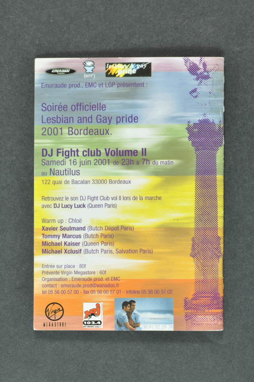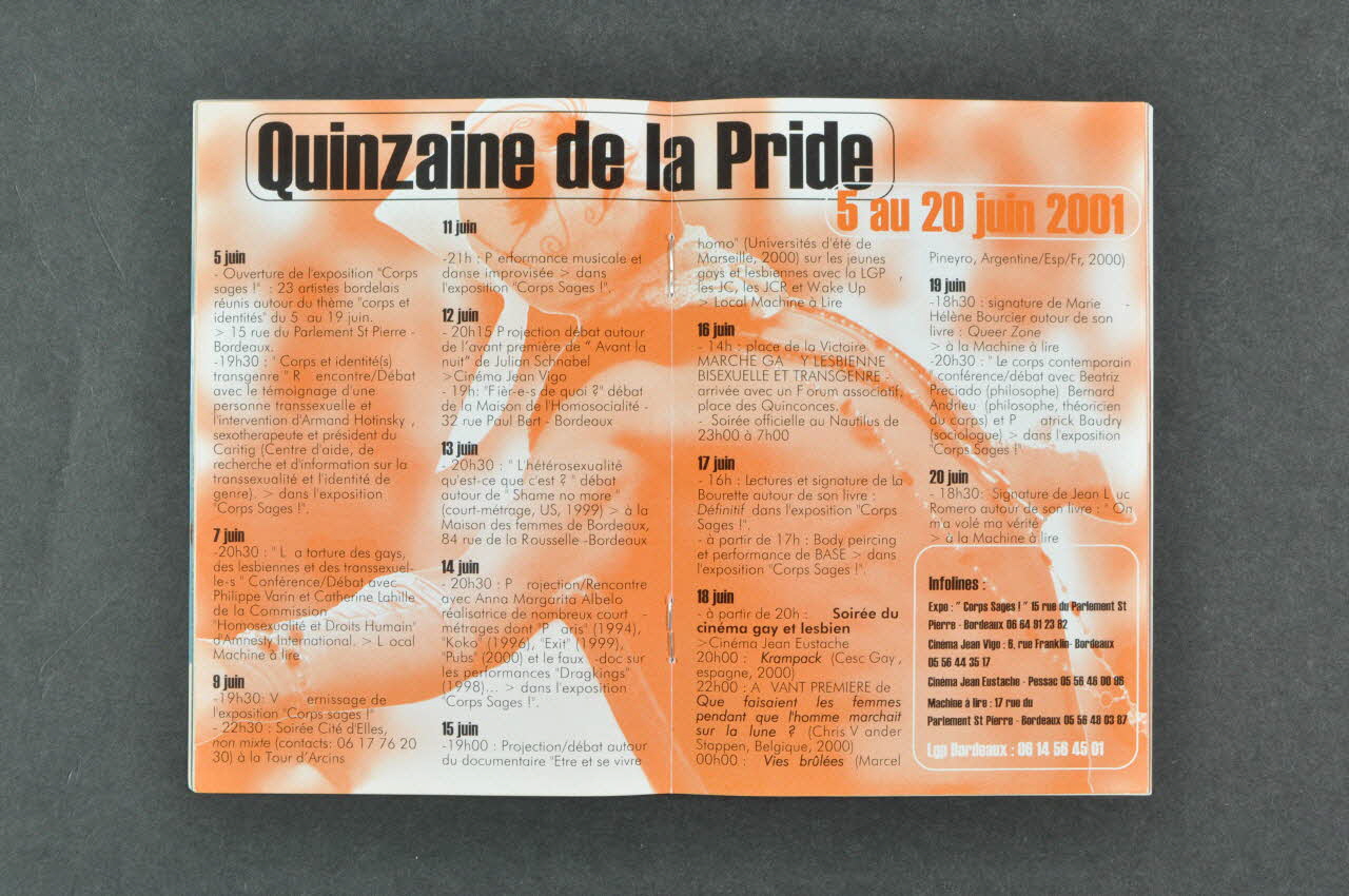 Lesbian & Gay Pride Bordeaux présente // Samedi 16 juin // Marche Gay, Lesbienne, Bisexuelle, Transgenre // Bordeaux // 14 h Place de la Victoire // 2001 // Pride // Programme de la quinzaine du 5 au 20 juin // Soirée officielle au Nautilus, // le 16 juin à partir de 23h00, sur la couvertureTexte