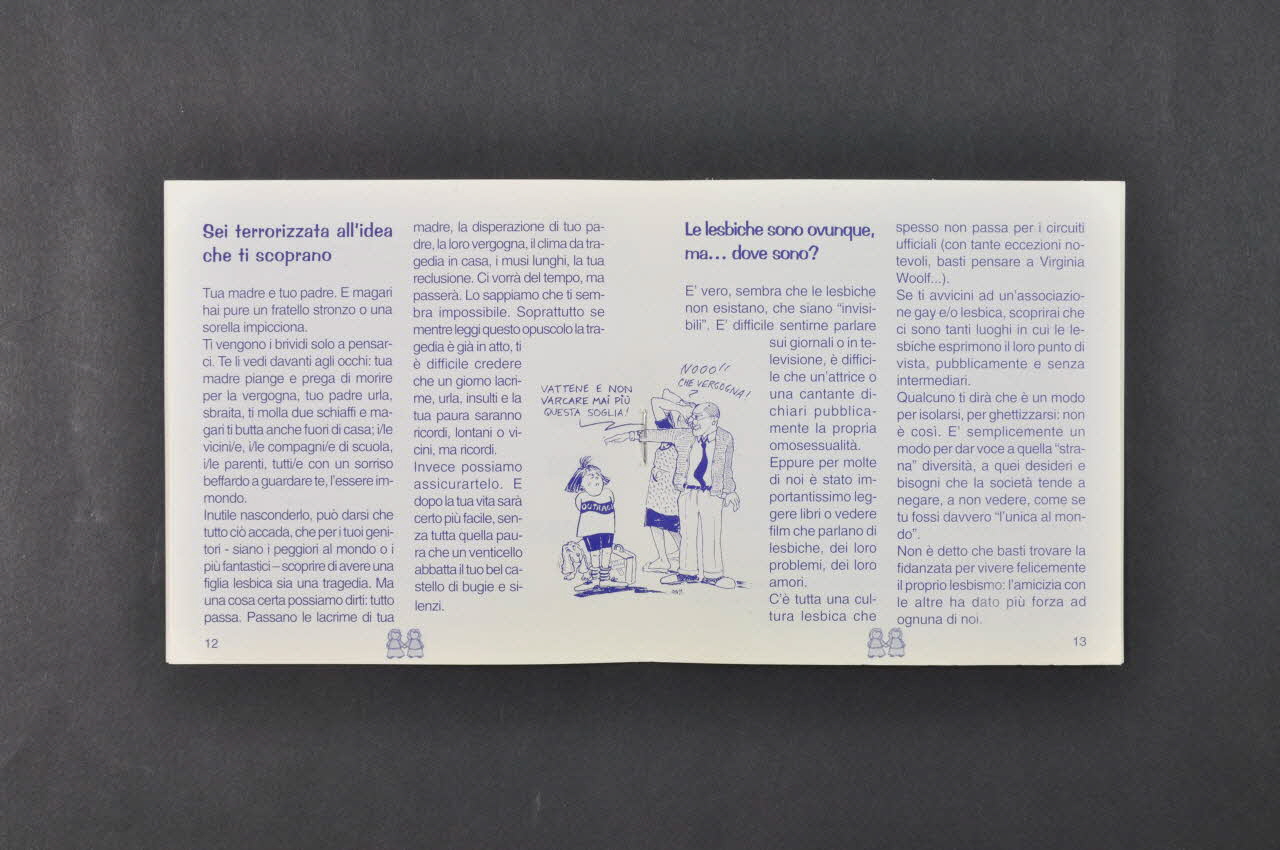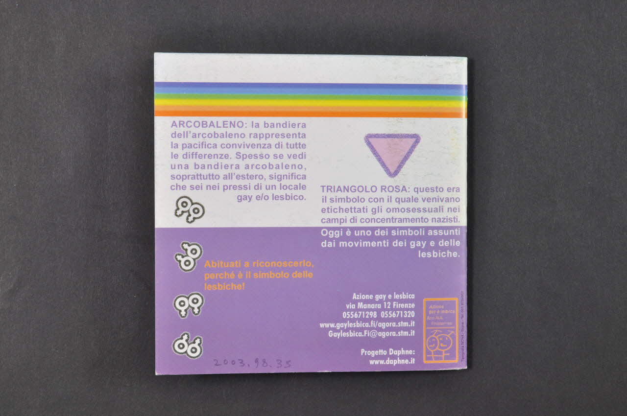 Au dos de la brochure, sur fond blanc et violet, sont présentes de nombreuses inscriptions, surmontées d'un triangle rose et d'une bande aux couleurs de l'arc-en-ciel. A l'intérieur, on trouve des conseils à une jeune fille qui se sent différente, illustrés de dessins de type BD : qu'est-ce que cela signifie, comment le dire ? Adresses utiles ? Des lesbiennes célèbres, films et livres.