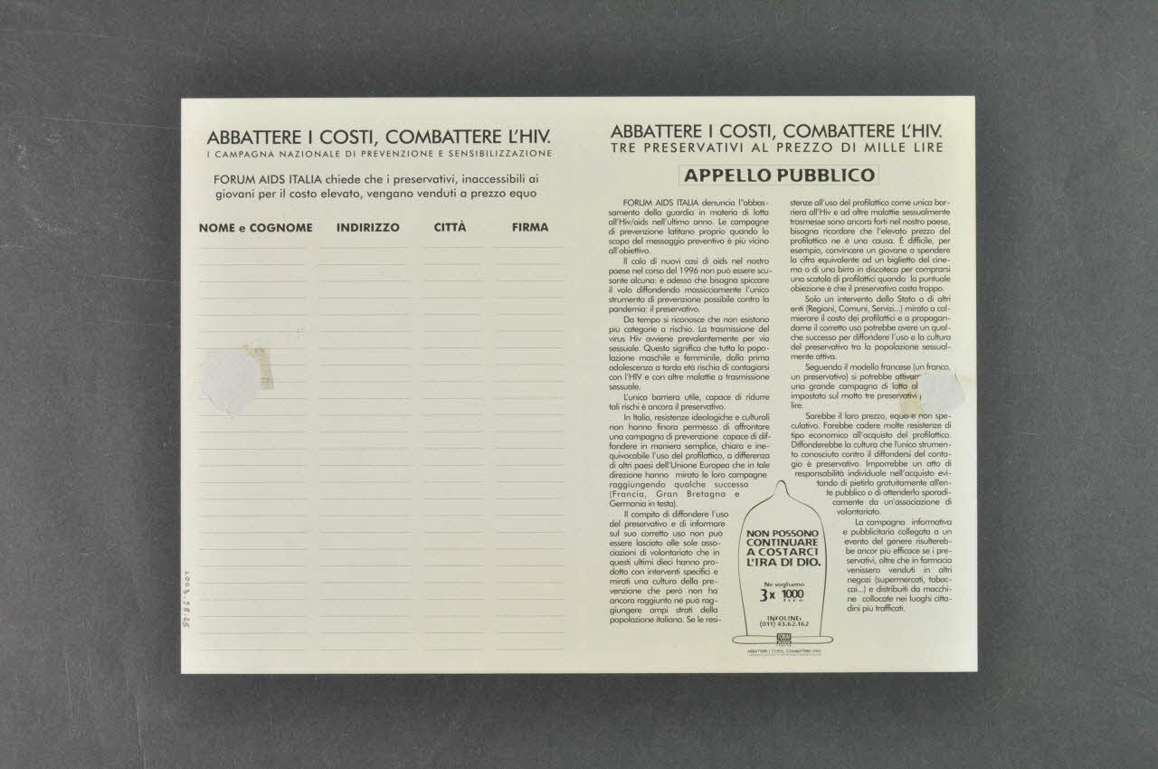 FORUM AIDS ITALIA denuncia [...] cittadini più trafficati. (En lettres noires avec les trois premiers mots en majuscules. En dix paragraphes.), versoFORUM AIDS ITALIA chiede que [...] a prezzo equo // // TRE PRESERVATIVI AL PREZZO DI MILLE LIRE (En lettres noires avec les trois premiers mots en majuscules. Dans la partie de la pétition, entre le slogan et les colonnes. // // En lettres noires, dans la partie avec le texte. Entre le slogan et le texte.), versoSlogan