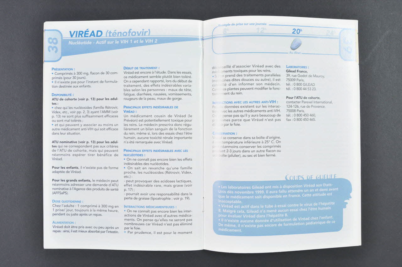 Page 2 // // SOMMAIRE // Les bases pour comprendre [...] ...4 // Préparer sa consultation [...] ...6 // Quand débuter un traitement ? [...] ...7 // S'organiser au quotidien avec son traitement [...] ...8 // Beneficier d'un traitement adapté [...] ...10 // Test de résistance ; dosage des médicaments [...] ...12 // Médicaments : quelle disponibilité (AMM, ATU) ? [...] ...13 // Un traitement, est-ce pour la vie [...] // (ou peut-on l'interrompre) ? [...] ...14 // Que faire quand les traitements ne marchent plus ? [...] 15 // Faire face aux effets indésirables [...] ...16 // Le mini-dictionnaire des effets indésirables [...] ...17 // Comment agissent les médicaments anti-VIH ? [...] ...32 // Combien coûtent les médicaments anti-VIH ? [...] ...63 // Pour s'informer, pour en parler [...] ...64 // // // PAGE 3 // // FICHES MÉDICAMENTS // Nucléosides // Rétrovir (AZT) [...] ...22 // Videx (ddl) [...] ...24 // Hivid (ddc) [...] ...26 // Epivir (3TC) [...] ...28 // Zerit (d4T) [...] ...30 // Ziagen (abacavir) [...] ...34 // Combivir [AZT + 3TC) [...] ...36 // Trizivir (AZT +3TC + abacavir) [...] ...37 // // Nucléotides // Viréad (ténofovir) [...] ...38 // // Non nucléosides // Viramune (névirapine) [...] ...40 // Sustiva ou Stocrin (éfavirenz) [...] ...42 // Rescriptor (délavirdine) [...] ...44 // // Antiprotéases // Invirase (saquinavir) [...] ...46 // Crixivan (indinavir) [...] ...48 // Norvir (ritonavir) [...] ...50 // Viracept (nelfinavir) [...] ...52 // Fortovase (saquinavir) [...] ...54 // Agénérase (amprénavir) [...] ...56 // Kalétra (lopinavir/ritonavir) [...] ...58 // atazanavir [...] ...62 // // Inhibiteurs d'entrée // T-20 [...] ...62 // // Stimulants de l'immunité // Macrolin (interleukine 2) [...] ...60 (Imprimé en pages 2 et 3, en noir), à l'intérieurTitre