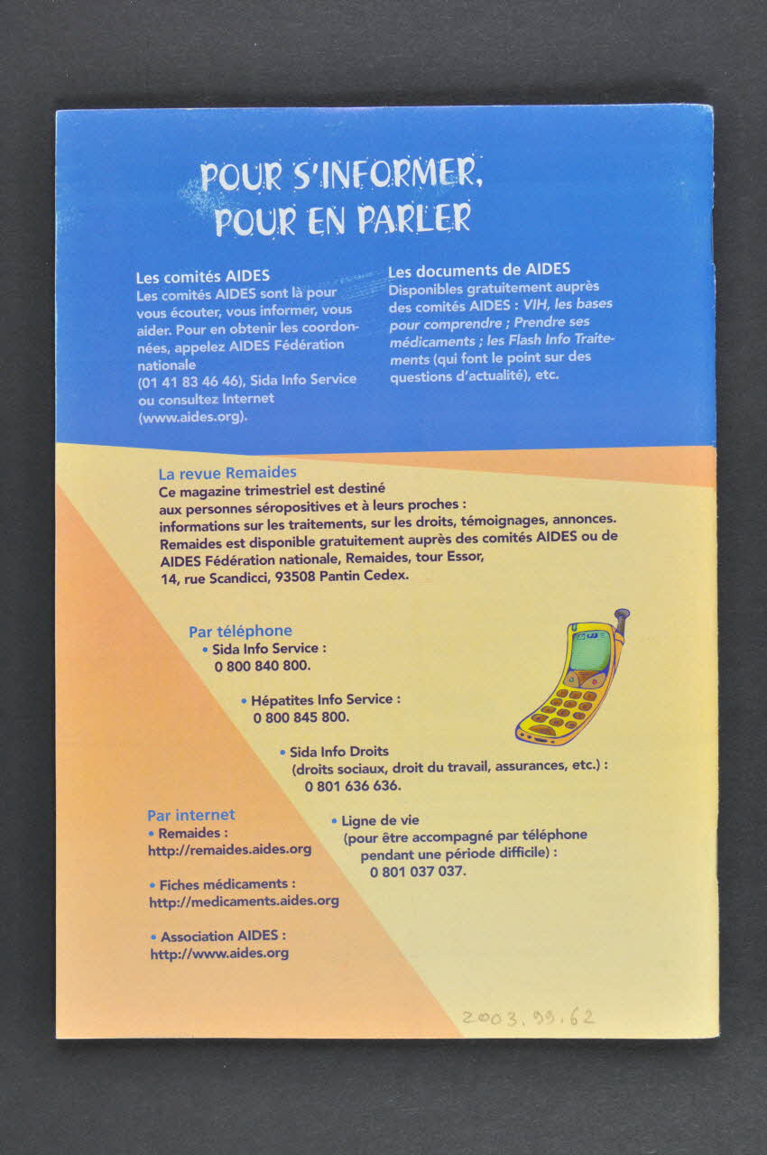 Elle comporte soixante quatre pages. Le recto présente un fond bichrome: les deux tiers inférieurs sont orange pâle à orange et le tiers supérieur est bleu. Une image est imprimée dans la partie inférieure. Elle représente trois personnages bras dessus bras dessous (à gauche une jeune femme de couleur avec "Aides" imprimé sur son tee shirt, à droite un homme en blouse blanche portant un stéthoscope, et au milieu un homme portant un t-shirt violet). Au-dessous, une inscription est imprimée en bleu, horizontalement. Dans le tiers supérieur, des inscriptions blanches sont imprimées horizontalement. Un logo associatif blanc est centré le long de la bordure supérieure. Au verso, le fond est toujours bichrome: bleu en haut, orange en bas. Des inscriptions blanches sont imprimées horizontalement dans le tiers supérieur. Et des inscriptions bleu à bleu foncé sont imprimées dans la moitié inférieure, accompagnées du dessin d'un téléphone mobile jaune. A l'intérieur, les inscriptions sont imprimées en noir sur fond blanc. Les titres sont inscrits en blanc sur bandeau bleu et les sous-titres en couleurs. De nombreux dessins colorés sont imprimés entre les paragraphes de textes.Inscriptions