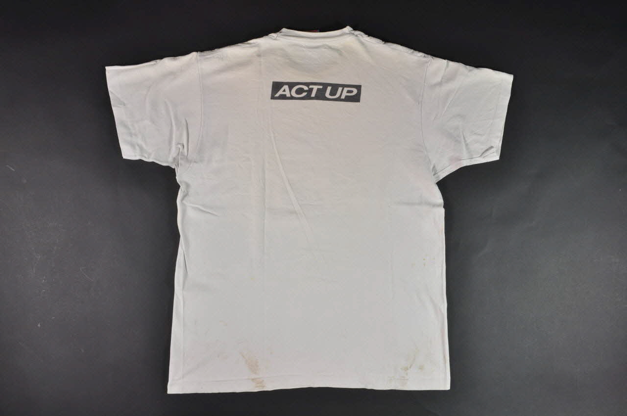 Au dos, sous l'encolure, en capitales blanches sur bandeau noir : "ACT UP" Tee-shirt usagé, porté par Ludovic Bouchet, et offert lors d'une conférence internationale par une association Act Up d'Amérique latine à Ludovic Bouchet militant d'Act Up qui a offert au musée ses tee-shirts de militant.Inscriptions