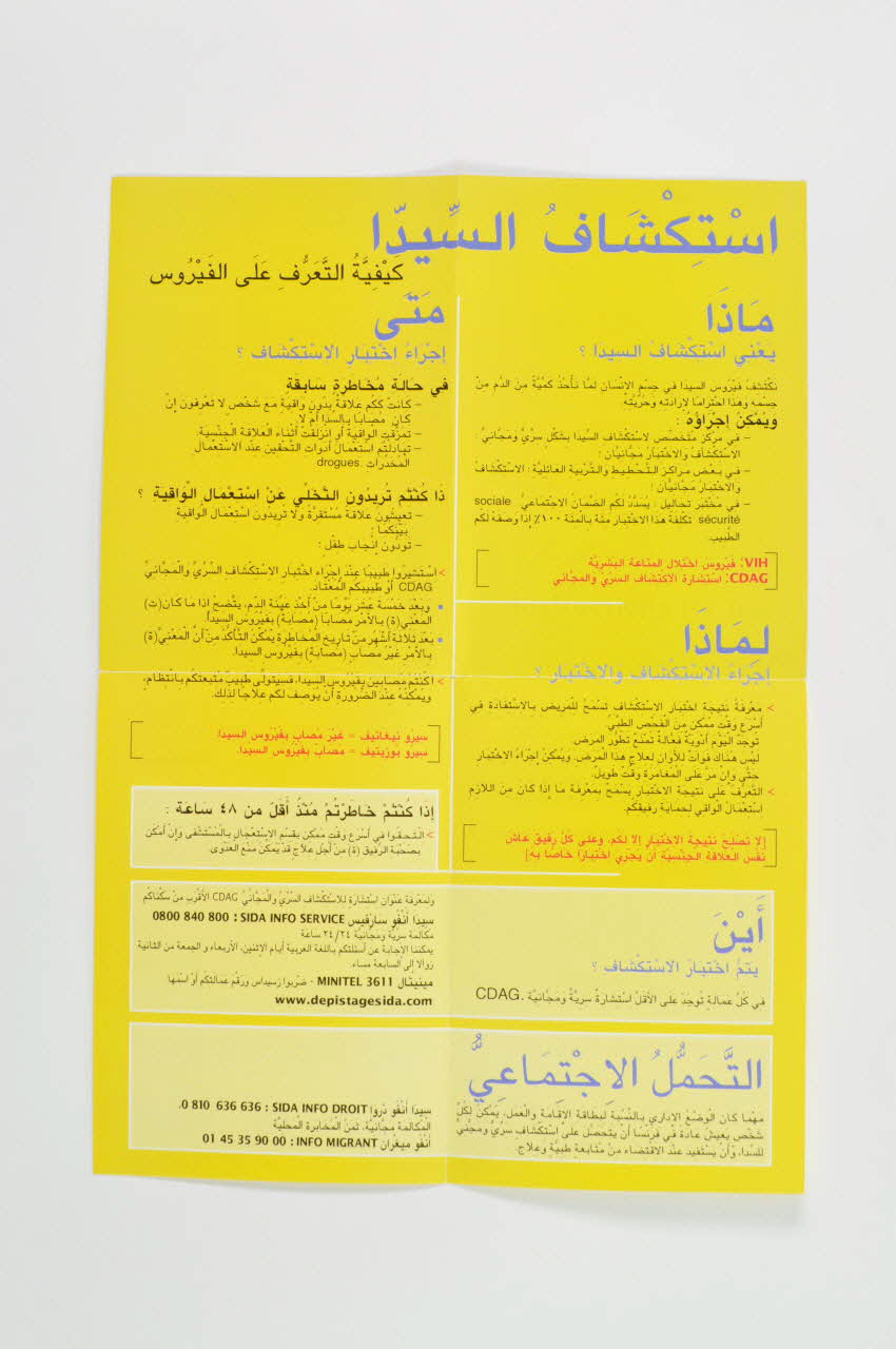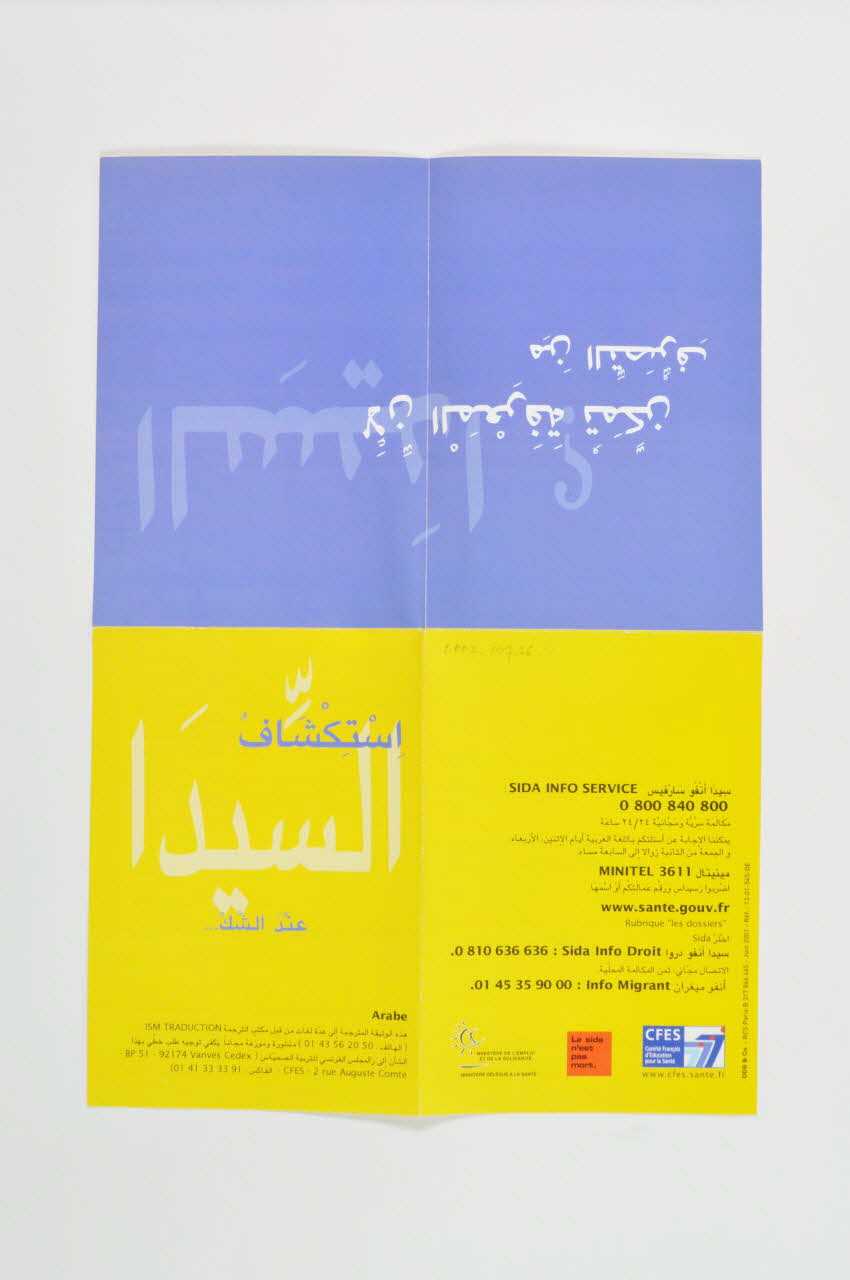 De : Lieu : FranceDate : 1 juin 2001Dans le cadre de la campagne : « le sida n’est pas mort » Version en arabe de 2002.107.23 destinée principalement aux migrants arabophones»