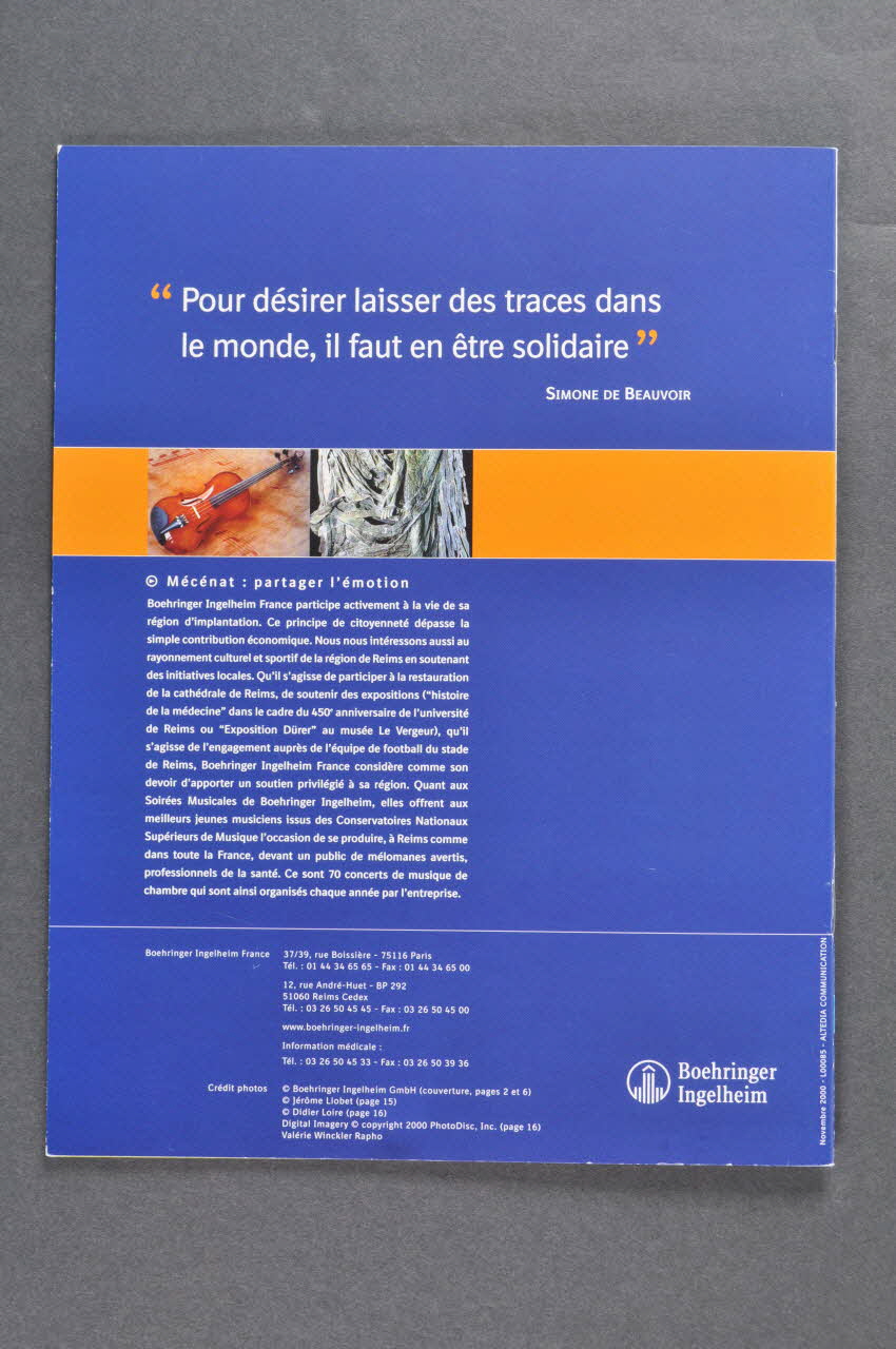 Au dos, sur un fond bleu, on trouve des textes en caractères blancs, dont un sur le "Mécénat : partager l'émotion" présentant des exemples de projets culturels dont Boehringer a assuré le mécénat. Tout en bas, se trouvent les coordonnées de Boehringer.